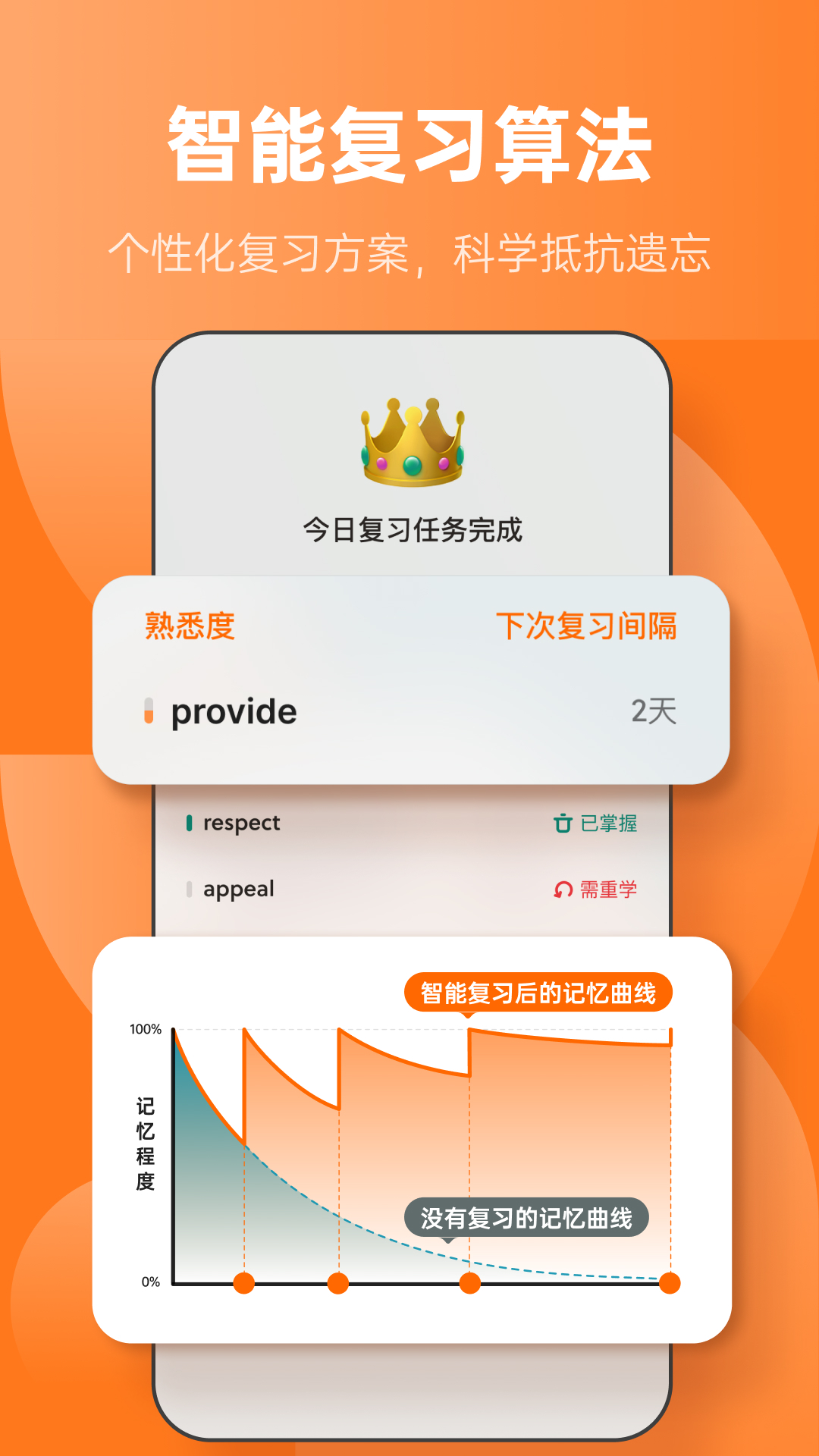 - 记忆算法智能安排学习,在遗忘临界点提醒复习