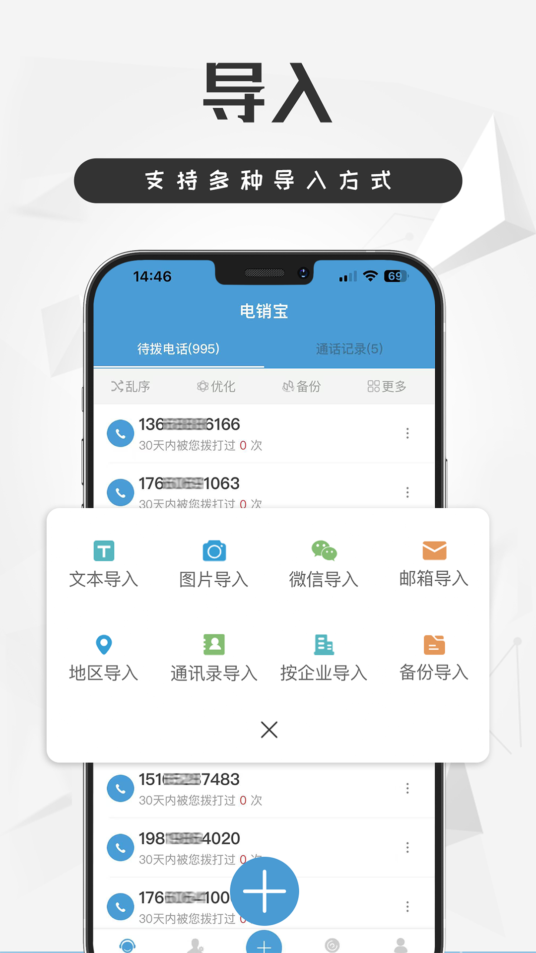 号码导入:支持文本、图片、微信、邮箱等多种导入方式�号码优化:可对号码进行去重,去外地号,去空号停机等操作�连续拨打:可进行连续拨号并可设置连续拨号时间间隔