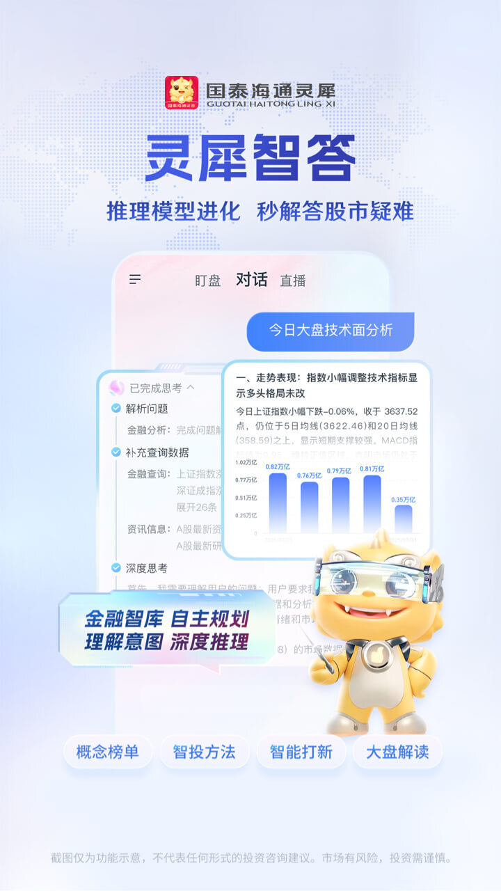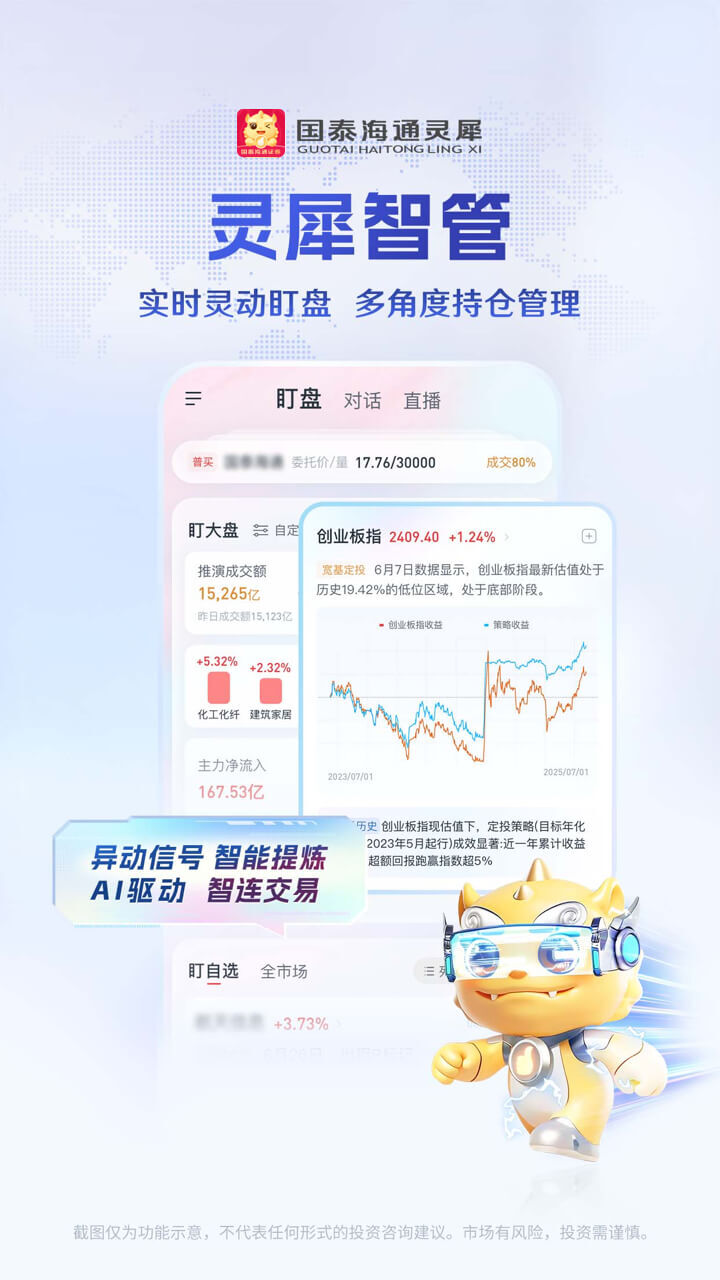 国泰海通灵犀APP聚焦AI技术与多元客户服务场景的全面融合,创新打造“盯盘、对话、直播”三大智能服务界面,适配用户操作习惯支持经典版屏一键切换,突破性实现四屏无缝衔接,深度融合君弘智投服务体系,打破单一服务边界,让智能工具与专业服务深度协同,打造全流程智能服务体验。
