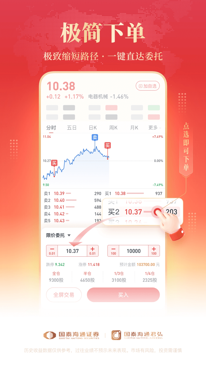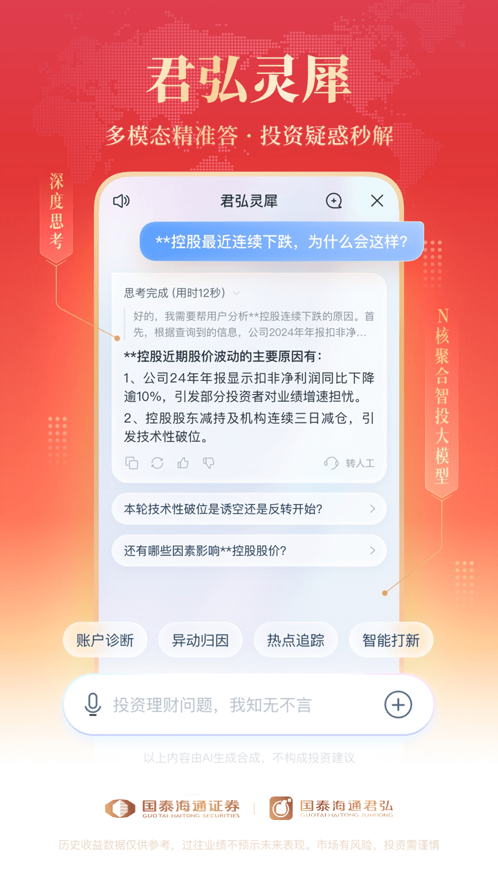 国泰海通君弘App是国泰海通证券倾力打造的一站式综合理财平台。由国泰海通证券自主研发,集闪速全球行情、场景化交易及账户、前沿人工智能、集萃理财商城和精选投资资讯等模块于一体。截至2025年6月,拥有用户超过6000万,获得权威大小奖项共100余项。
