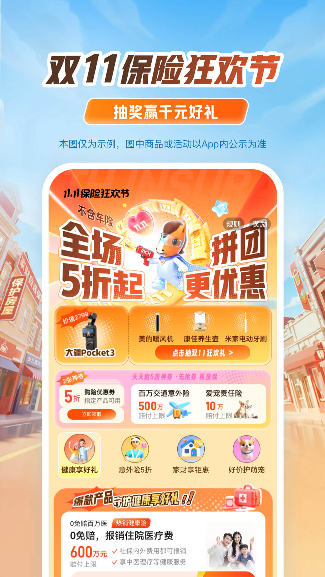 1、【双11保险狂欢节】免费抽奖赢大疆云台相机、华为手机等好礼,全场保障低至5折,拼团可享折上折!