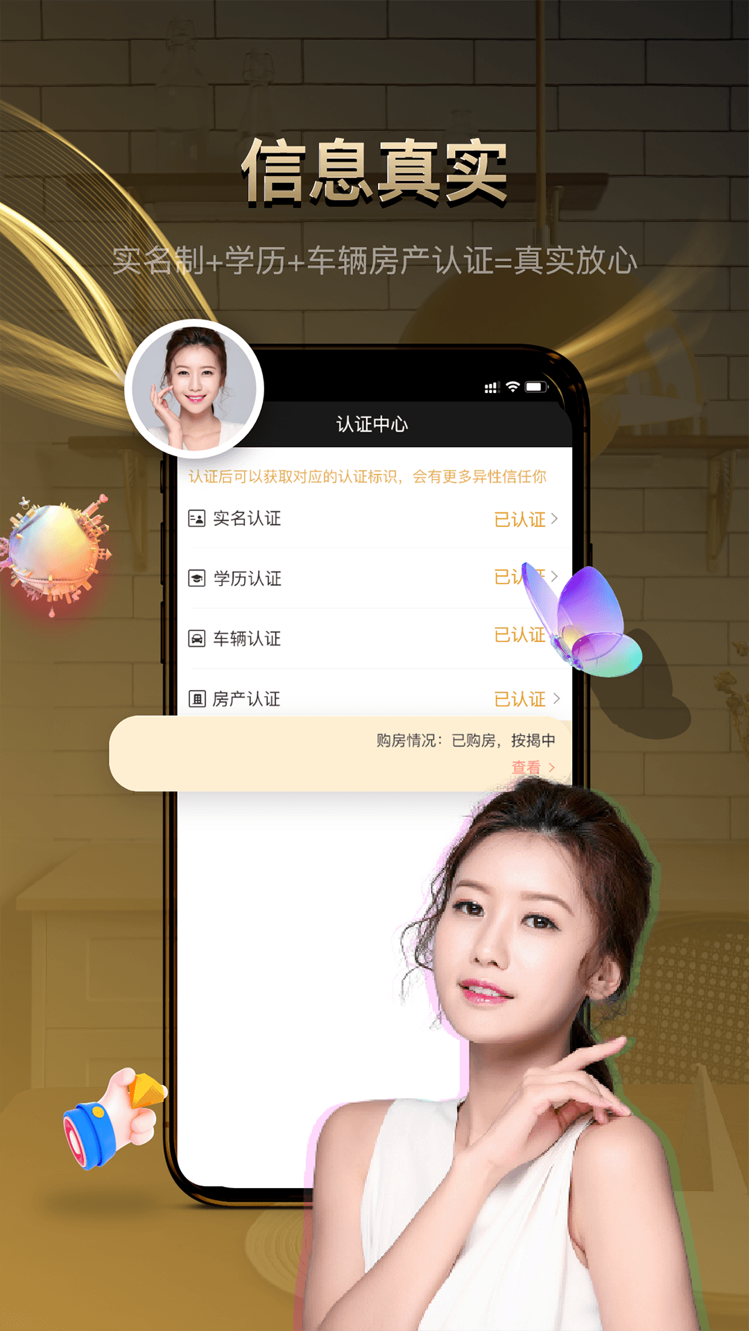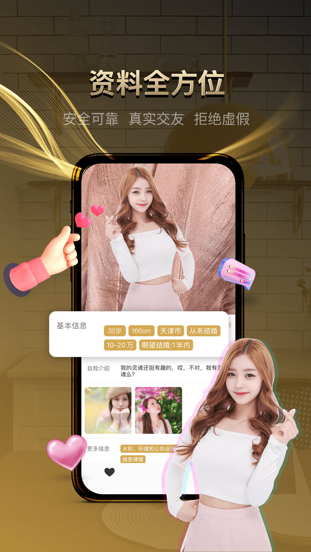 2. 真实认证・真诚交友,用户上传真实个人信息(身份、学历、房产、车辆等),通过人工 + 系统双重审核,杜绝虚假资料、僵尸账号,极大确保每一位匹配对象都是 “以结婚为目的” 的真诚用户。