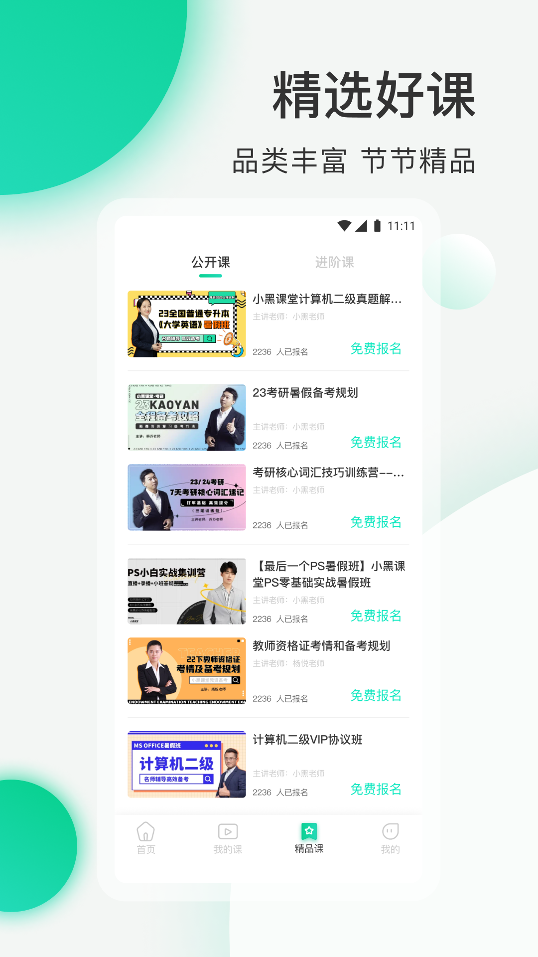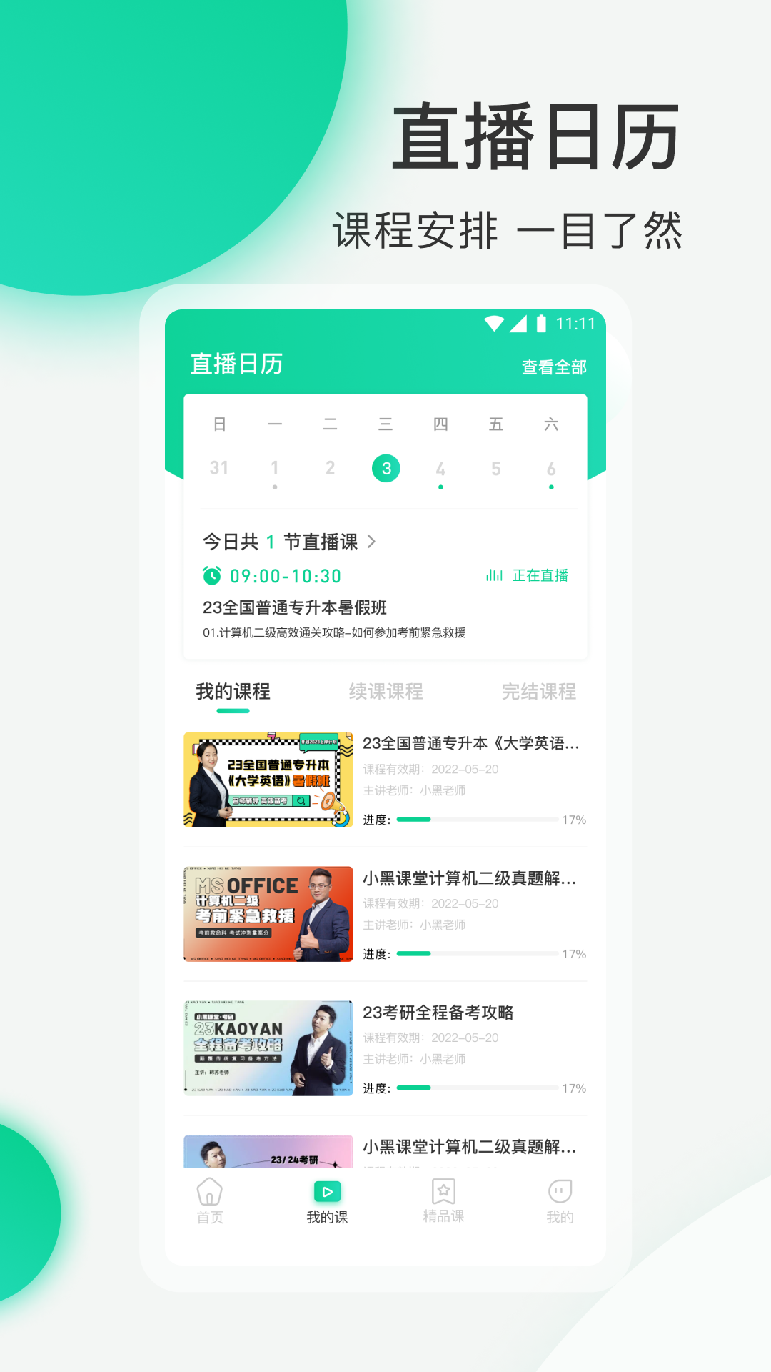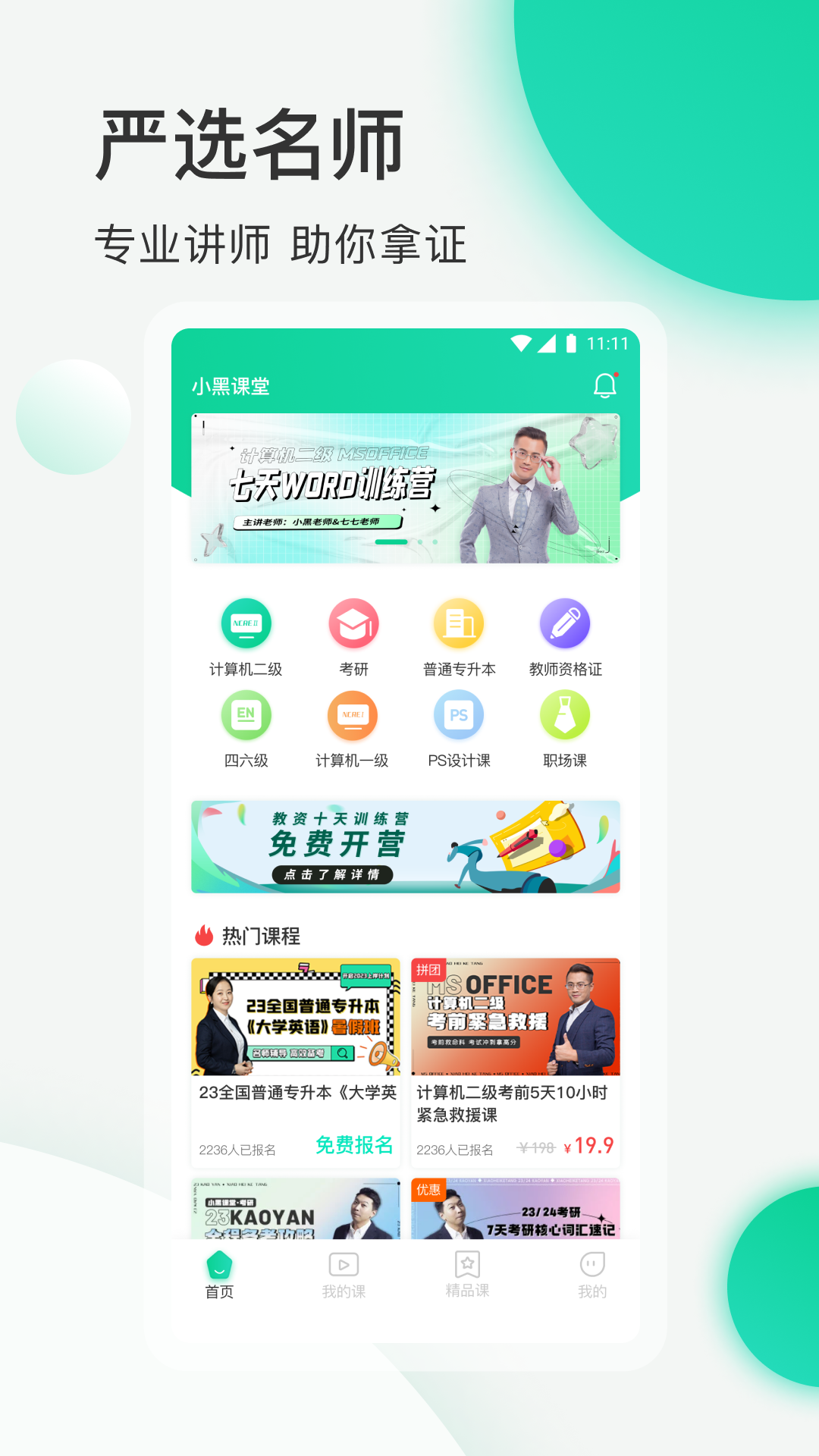 小黑课堂是专业的大学生在线学习平台,专注计算机二级考证、考研、英语四六级、教师资格证、职场课,提供完整的计算机二级、考研、教师资格证、职场课等相关的直播课、录播课、配套资料、模拟测试等考试学习解决方案,旨在提升大学生职场办公能力,学好技能,顺带考证!