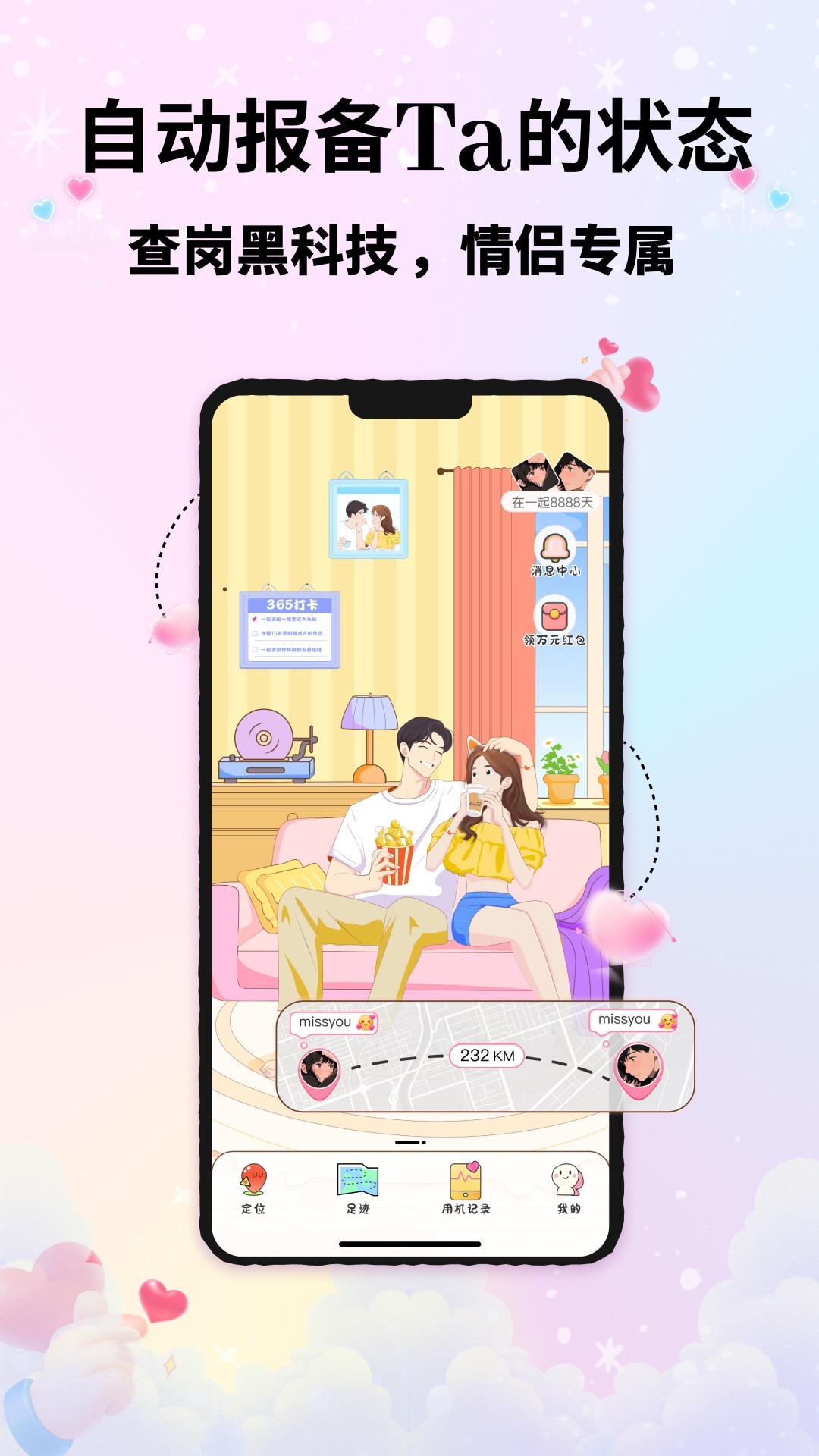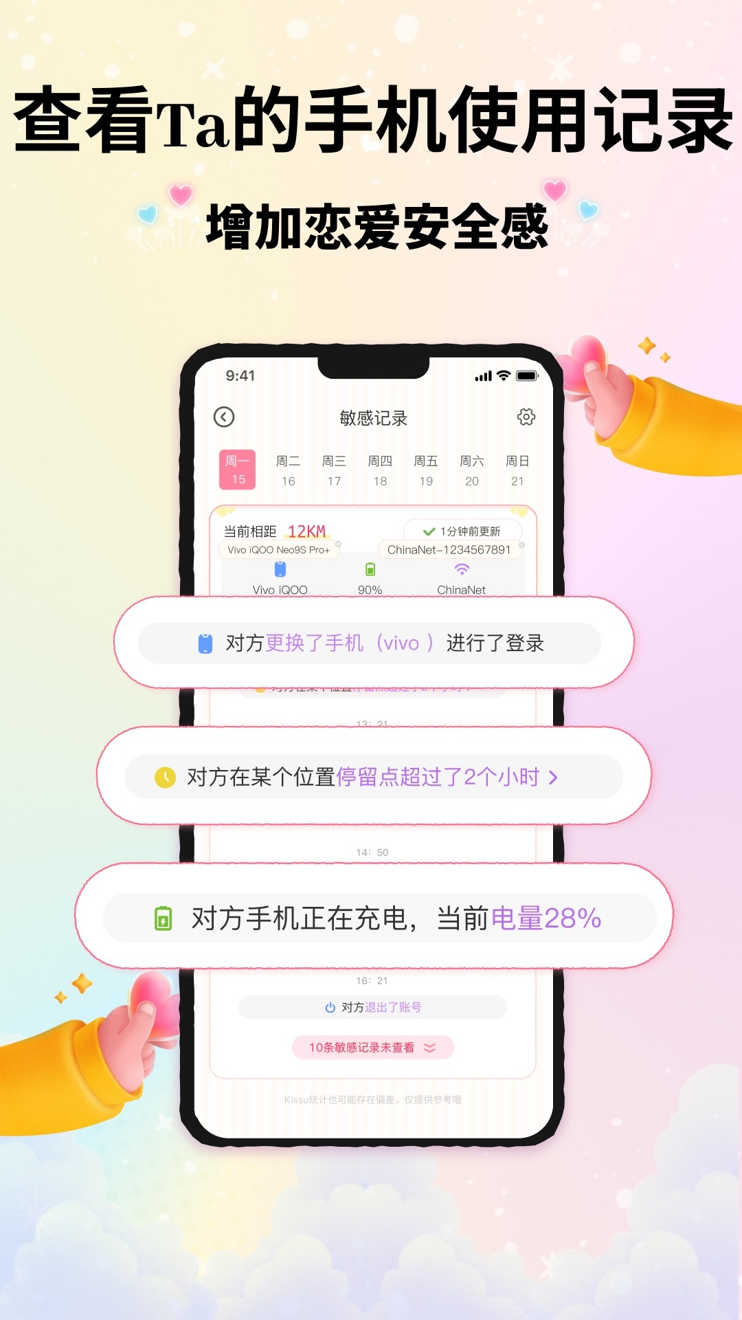 Kissu,记录情侣的恋爱日常,记录与TA相处的点点滴滴,一起书写你们两的甜蜜回忆。还可以实时查看情侣位置和历史轨迹,整天行程轻松掌握。