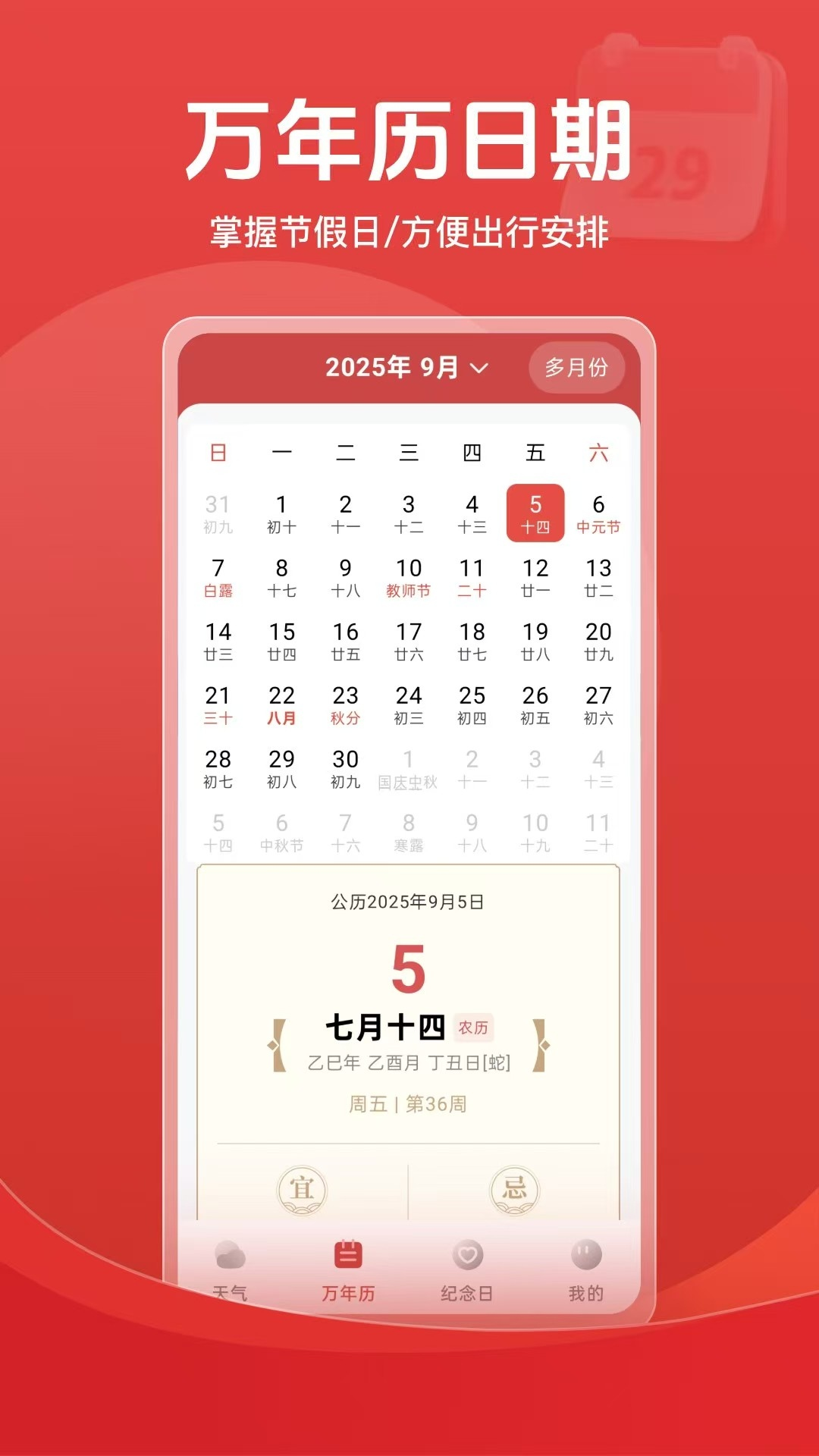 【节日庆祝】:临近春节、中秋节等传统节日,APP 会提前提醒您节日的到来,让您有足够的时间准备节日礼物、安排家庭聚会。同时,通过日历上的节气信息,您还可以了解到节日的传统习俗,感受浓厚的节日氛围。