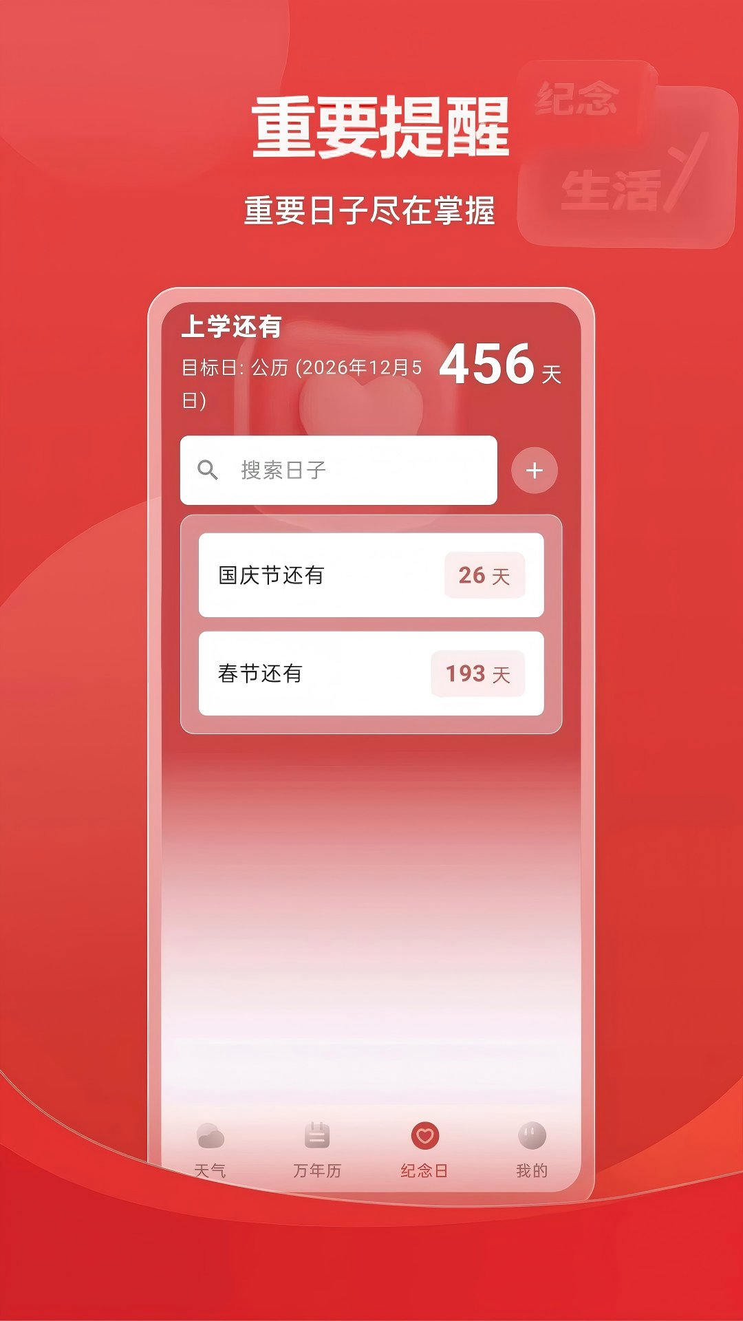 【生日纪念日倒数提醒】:这是 APP 的核心功能之一。您可以轻松添加亲人、好友、伴侣的生日以及各种重要纪念日,设置提前提醒时间。在重要日子到来之前,APP 会通过弹窗、震动、铃声等多种方式提醒您,再也不用担心忘记这些重要时刻,让每一个生日和纪念日都能充满仪式感。例如,您可以提前为父母的生日设置提醒,准备一份惊喜礼物;也可以记录与爱人的恋爱纪念日,让爱情在每一个特殊的日子里升温。