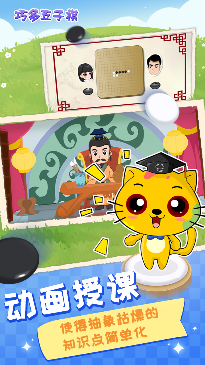 教学内容采用人物互动方式来展开,生活化的对话结合动画的表达形式,亲切自然,使得抽象枯燥的五子棋知识润物细无声的被孩子不知不觉就接受和了解。