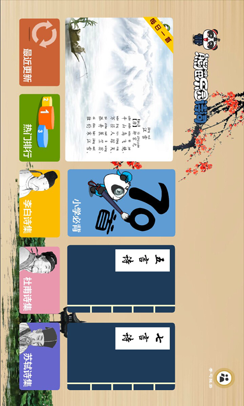熊猫乐园是为2-10岁小朋友开发的儿童学习乐园,由熊猫乐园倾力打造的熊猫乐园诗词,包括上百首古代诗词当中比较热门、受广大小朋友和家长所喜爱的经典诗词。熊猫乐园诗词中的每首都是精心打造,全新的视觉体验,不一样的画面场景,让您有不一样的视听感受。诗词中蕴含着丰富的人文景观和人生哲理,是帮助孩子们认识大自然、了解世界的媒介之一。让宝宝们在轻松、快乐、自然的状态下学习古诗,真的做到熟读唐诗三百首,不会作诗也会吟。