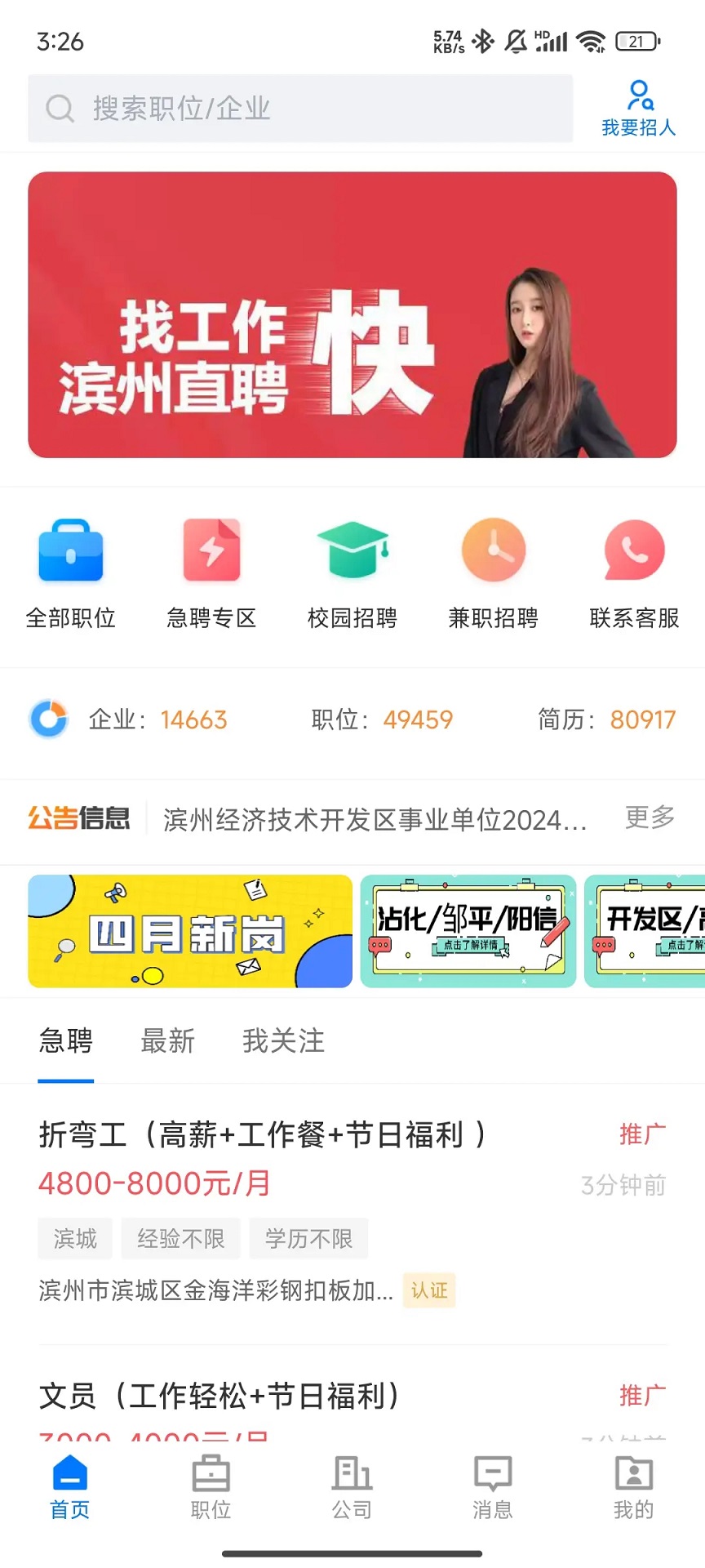 找工作 招人才 上滨州直聘 滨州直聘拥有丰富的招聘职位,海量滨州人才库及近百精准求职社群,助力企业招聘!为企业提供招聘渠道,帮助每一个求职者在滨州直聘找到合适的工作!
