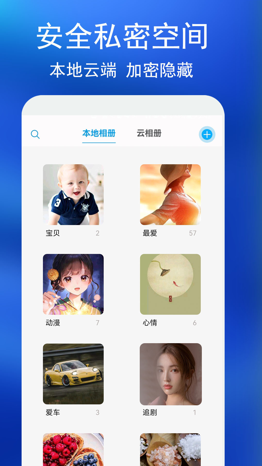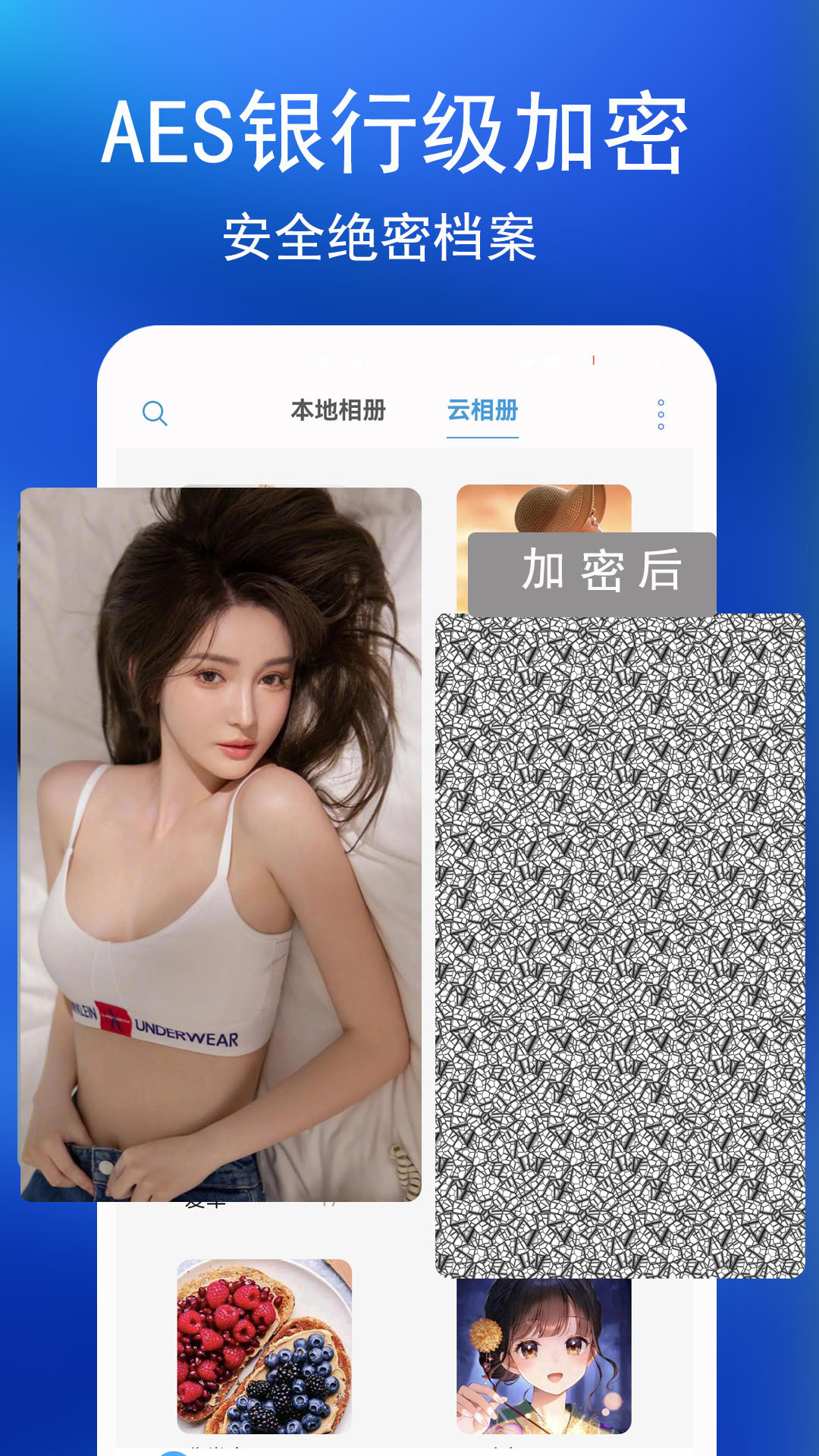 隐私相册,隐私图片和视频加密专家!隐藏您的重要图片、视频和文件,采用AES加密技术,绝密存贮,再也不用担心隐私泄露,并且支持一键上云,永不丢失。