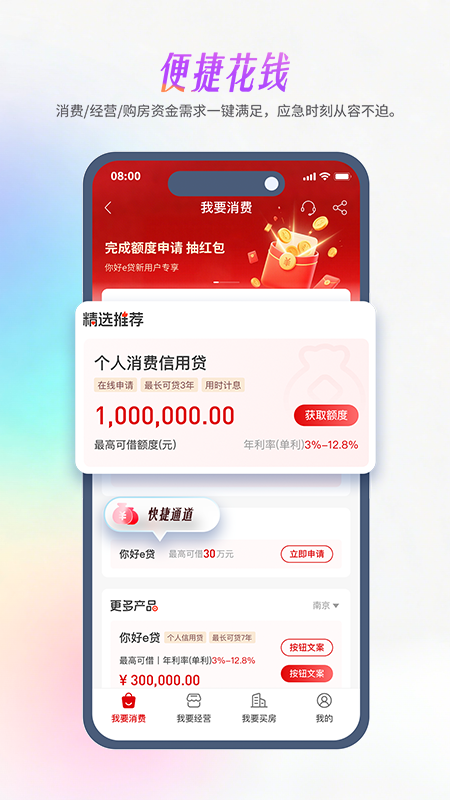 南京银行 App8.0 版本全新升级!围绕“智慧管钱、专业赚钱、便捷花钱、精致省钱、安全守护” 五大核心方向,全面优化功能体验与服务效率,无论是追求高效理财的 “理财达人”、肩负家庭责任的 “家庭支柱”,还是注重生活品质的 “品质消费者”,都能在这里找到贴合需求的贴心金融解决方案,让财富管理更轻松、生活服务更便捷。