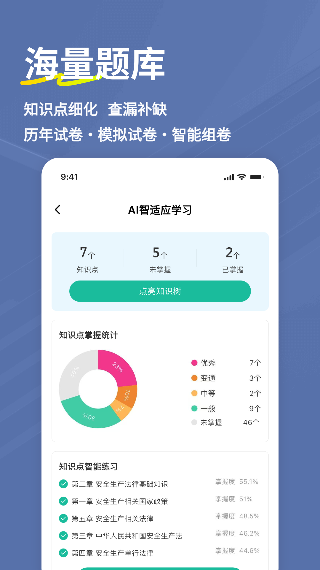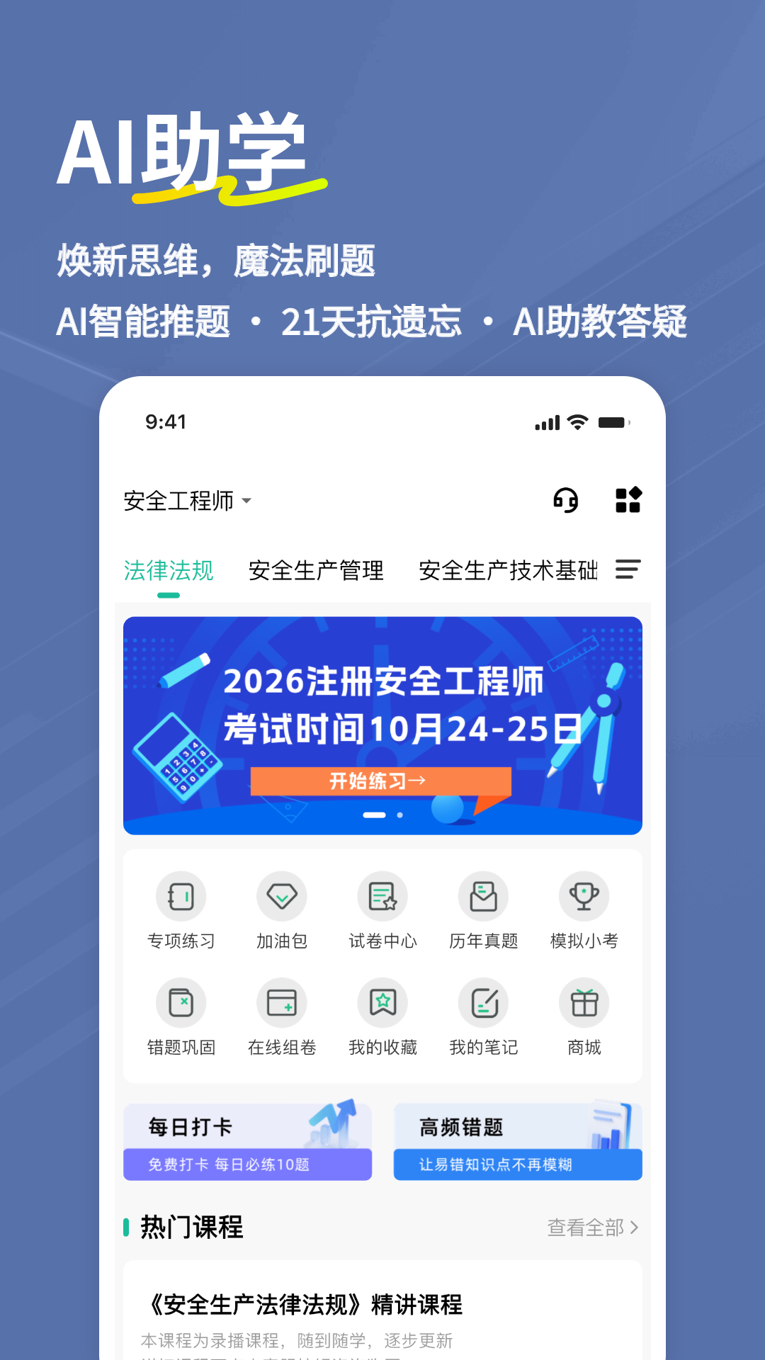 AI助学焕新上线,章节刷题严格依据注册安全工程师考试大纲,AI智能推题精准定位薄弱环节,结合艾宾浩斯遗忘曲线研发“21天抗遗忘训练”,让考点过目不忘!