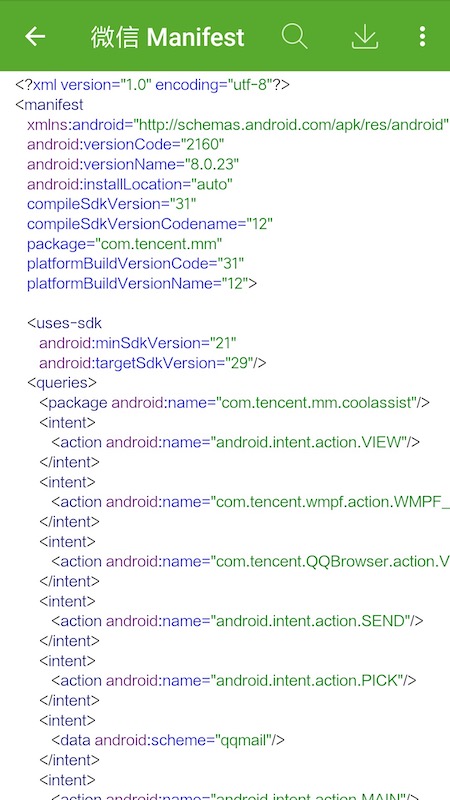 支持查看任意 App Manifest 信息,支持查找,支持以 TXT 或者 HTML 格式保存到 SD 卡。