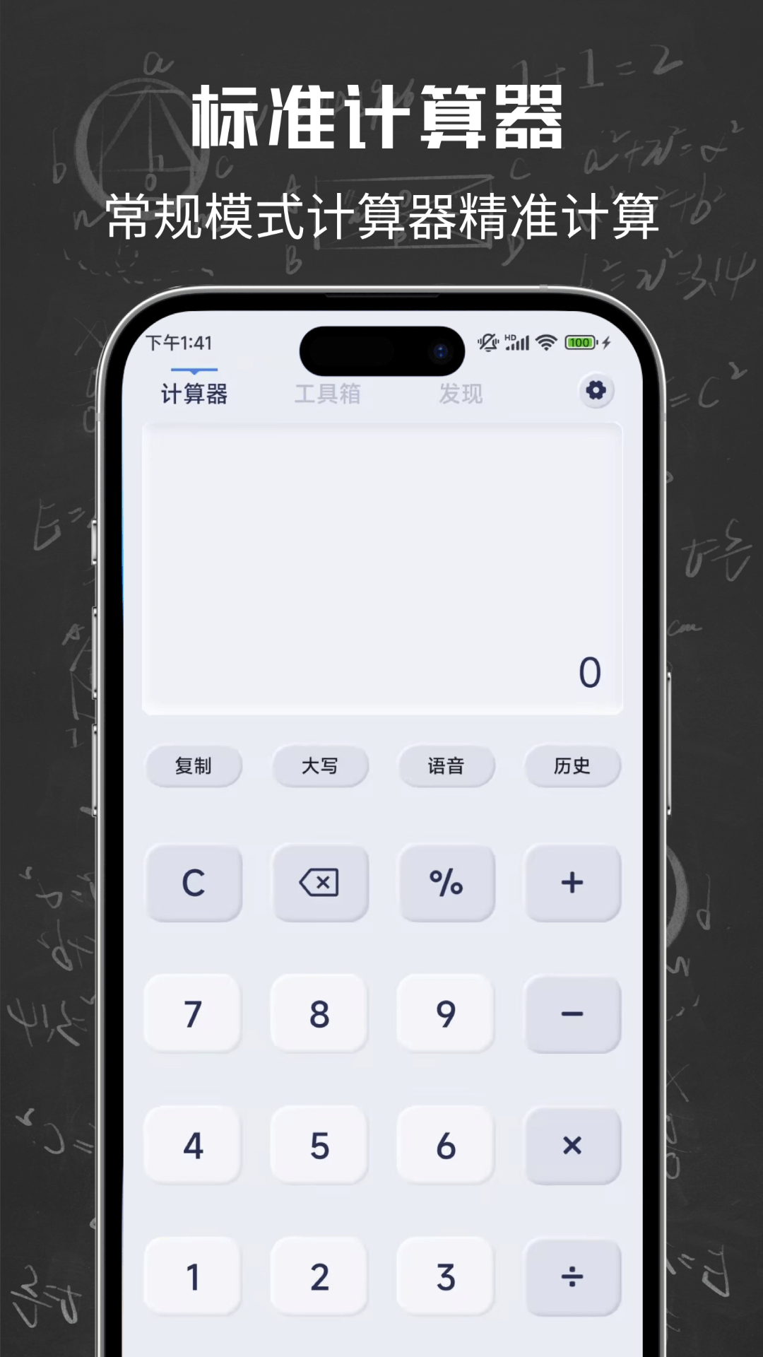 [标准计算器]界面简洁,方便操作,支持语音播报、历史记录、大写金额转换、复制的计算器。