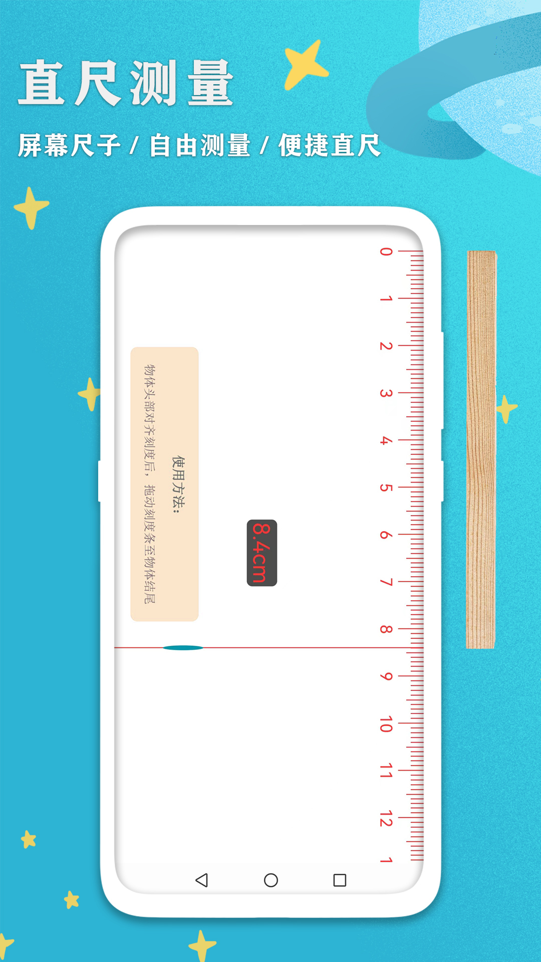 - 直尺测量:通过手机分辨率模拟尺子刻度,让手机替代传统直尺,满足您的测量需要;