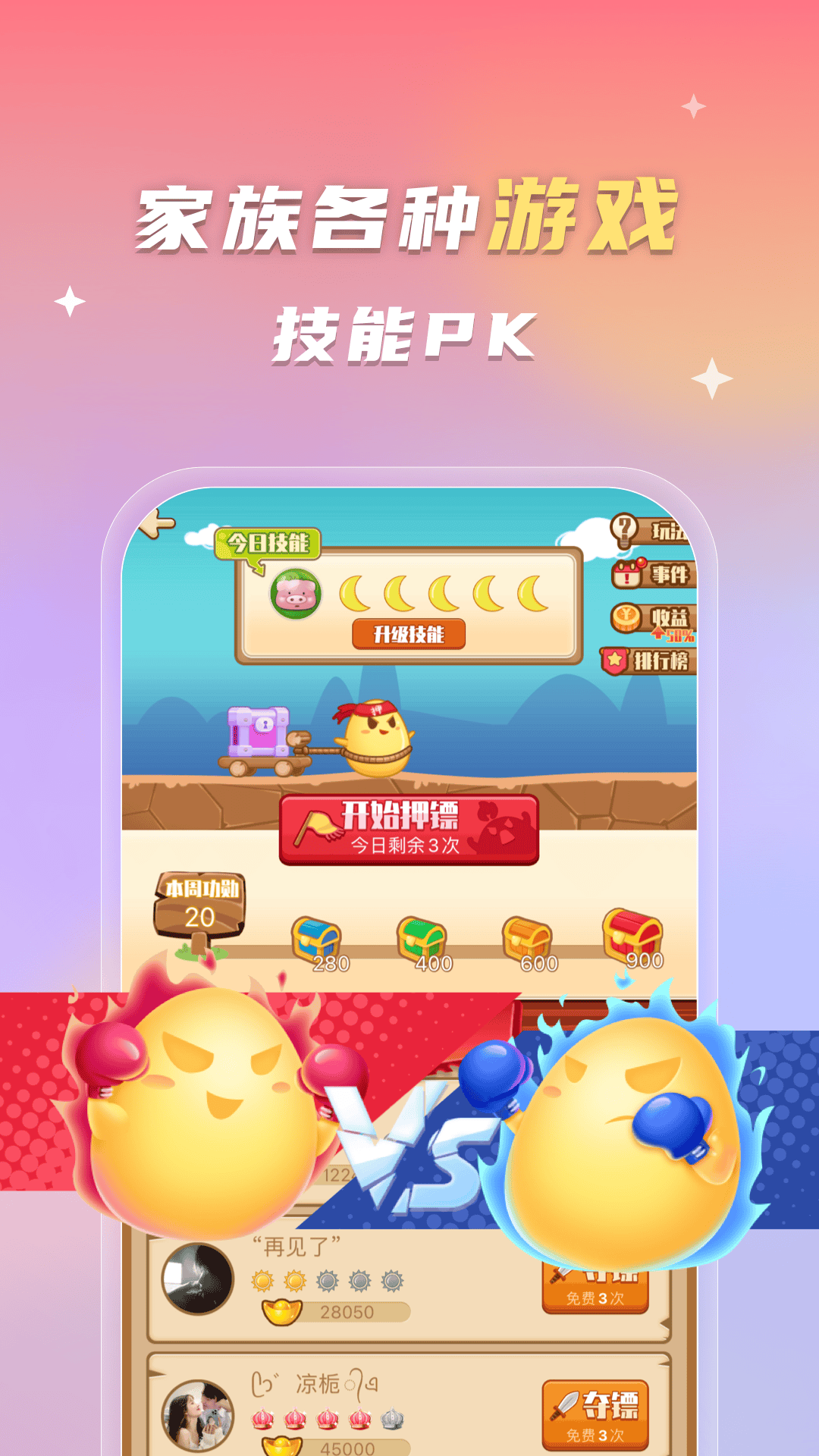 【家族乐园】押镖夺宝、科举答题、家族对战,团结一心捍卫家族荣耀,还可领取丰富游戏道具完成日常任务。