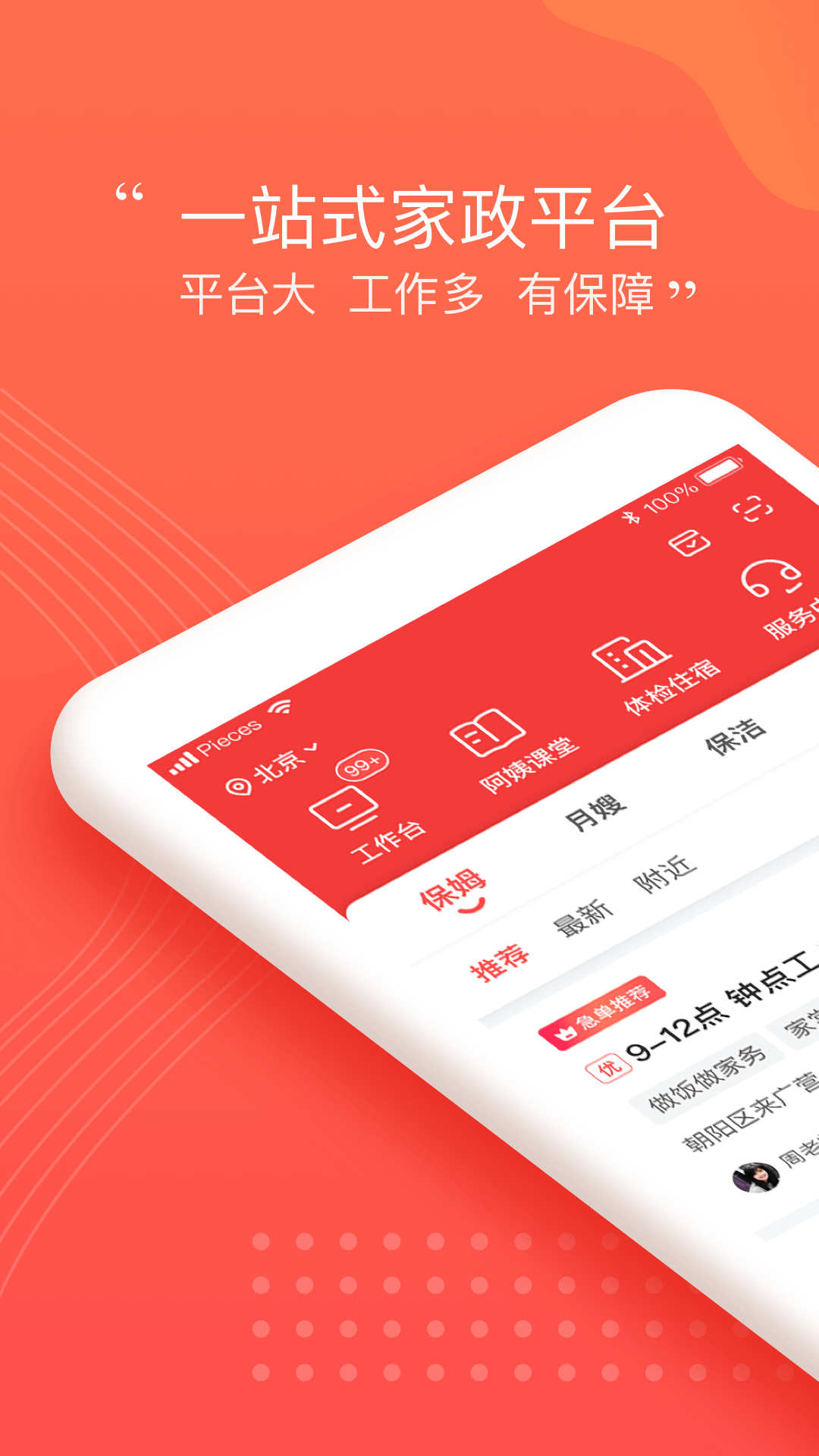 阿姨一点通拥有海量真实优质家政类订单,阿姨们可以看到雇主发布的需求从而实现抢单,同时我们拥有标准化的岗前培训系统,高准度的订单匹配,完善的商户保障体制,完美解除阿姨们的后顾之忧。