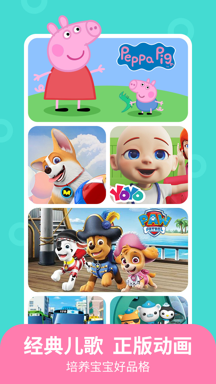 还收录了海量宝宝喜爱的热门正版动画片:小猪佩奇、汪汪队、喜羊羊与灰太狼、倒霉熊、超级飞侠、舒克和贝塔、可可小爱、海底小纵队、瑞奇宝宝、太友和萌鸡小队……等等,超多小朋友喜爱的动画明星都在这里聚集,可爱萌趣的卡通形象陪宝宝一起度过快乐的童年!
