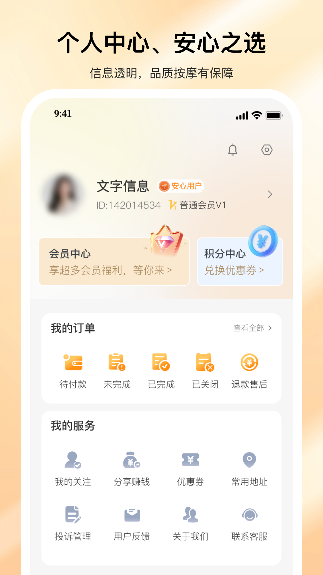 提供资金安全、技师定位、隐私保护,用品一次性或严格消毒,配备服务保险。