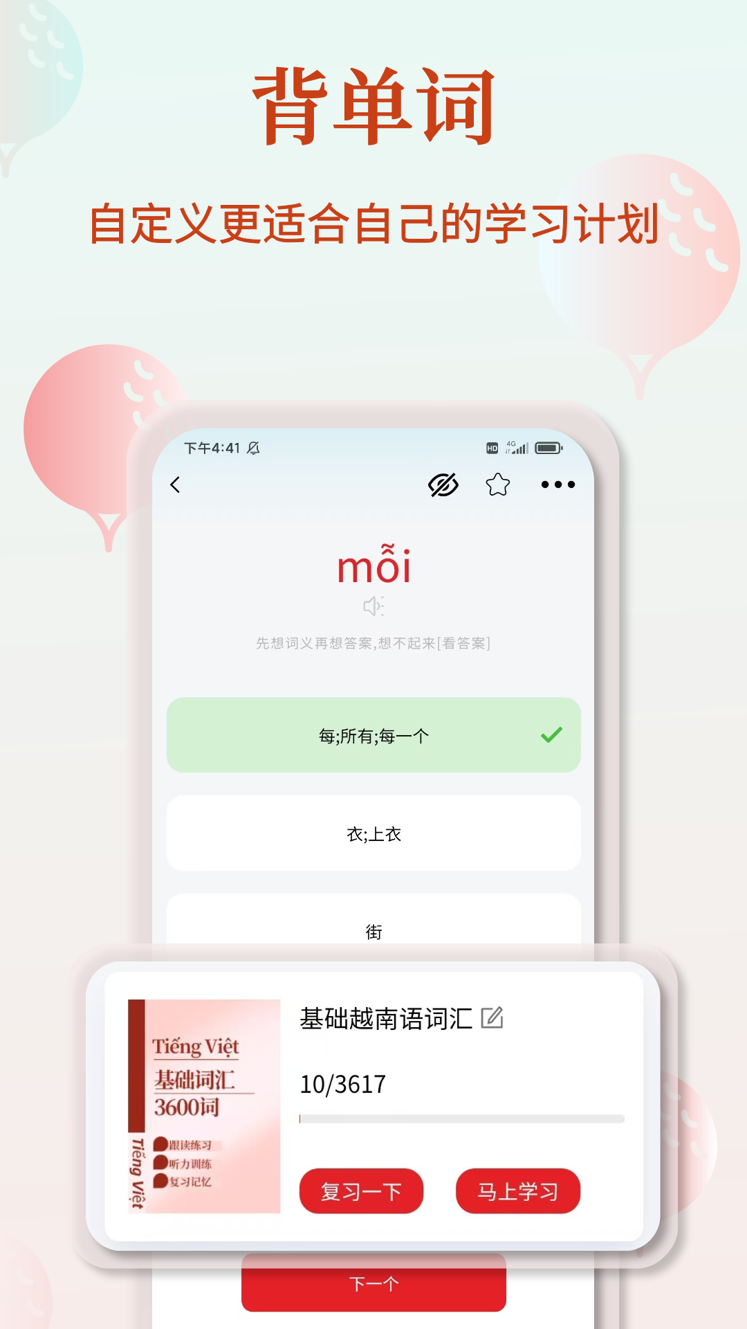 所有词库、主题词汇、日常用语等都支持加入随身听播放列表,选择想要听的内容,即使放下手机也可以实现随时随地听越南语学习
