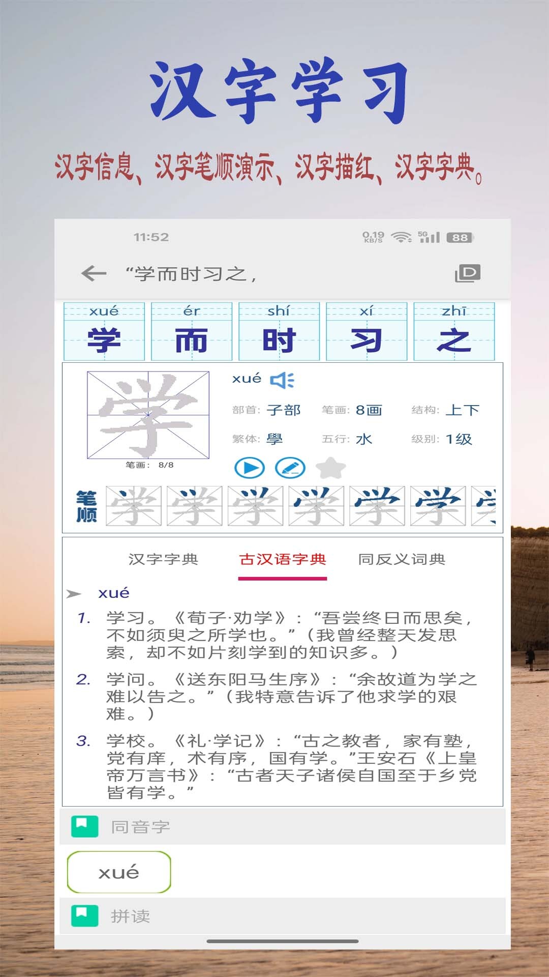 3. 汉字描红,教你学写汉字。手把手教你写汉字,可动态演示如何写汉字。