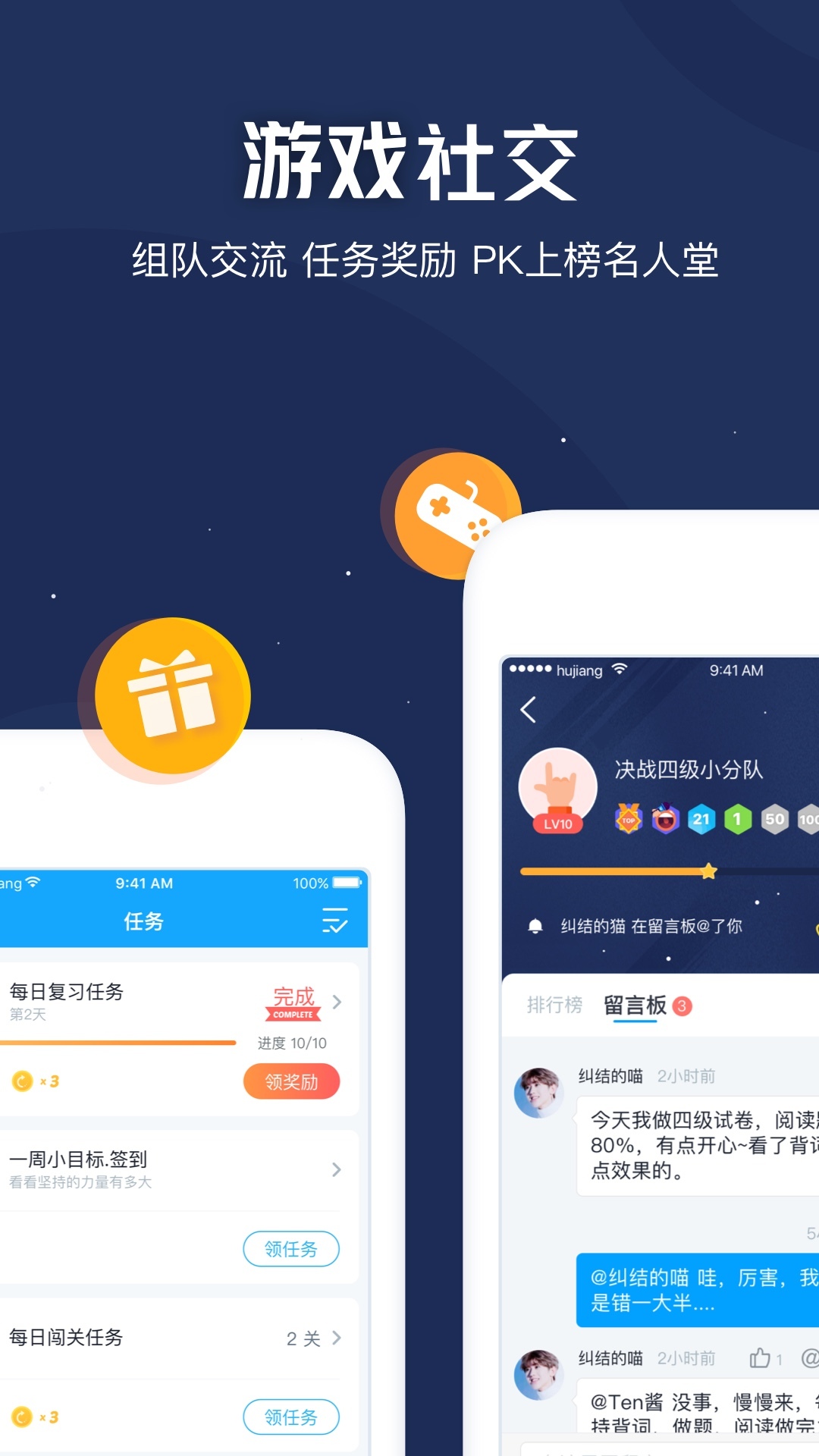 游戏化背词体验,好友PK大战,排行榜激励机制,社团讨论吐槽…在这里背词,除了收获更好的自己,最重要的是你还会很开心!