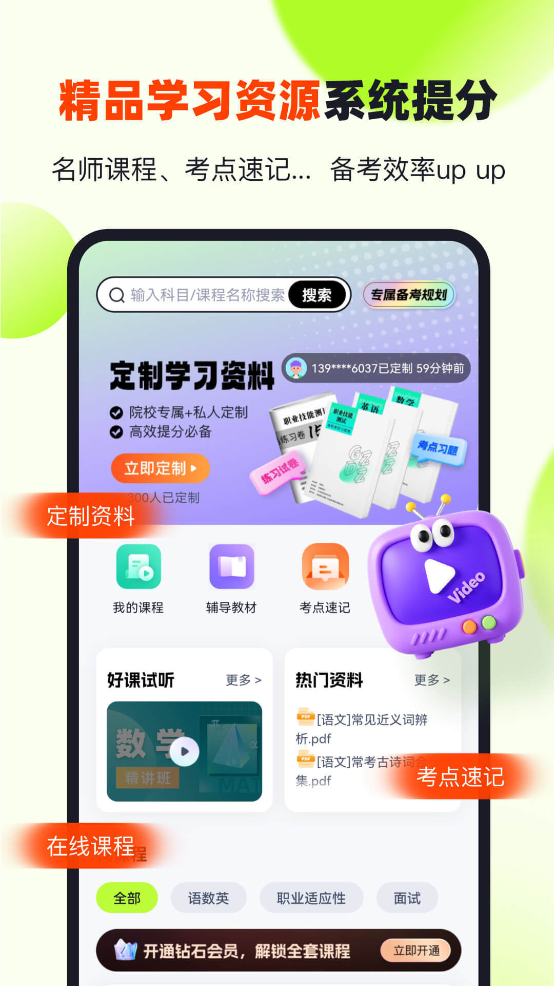 精品学习资源库 ,高效提分必备•名师课程:文化素质(语/数/英)+职业适应性测试精讲•考点速记/单词记忆/PDF资料库...学习资料一应俱全