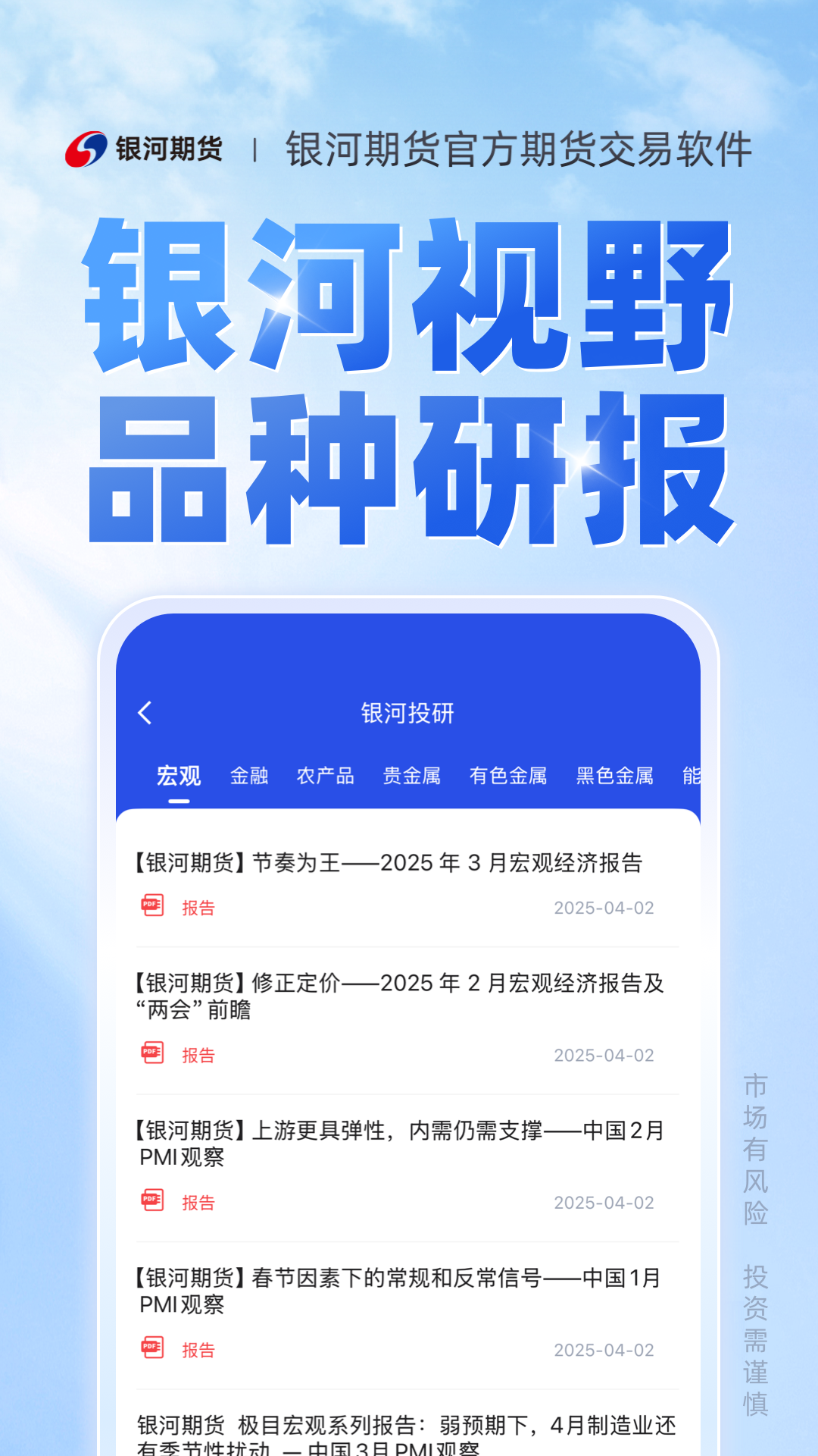 银河期货专业版APP是银河期货有限公司旗下产品,为投资者提供全面的期货行情、期权行情、掌上交易、金融资讯、掌上开户等金融服务。银河期货作为一家国有控股的期货公司,以强大的股东背景,稳健的经营作风,专业化、细致化、人性化的期货交易服务,为您在开户、交易、交割等环节提供便利。