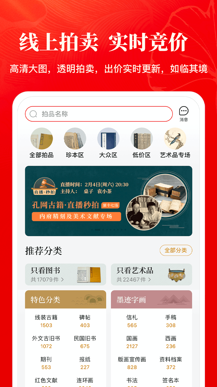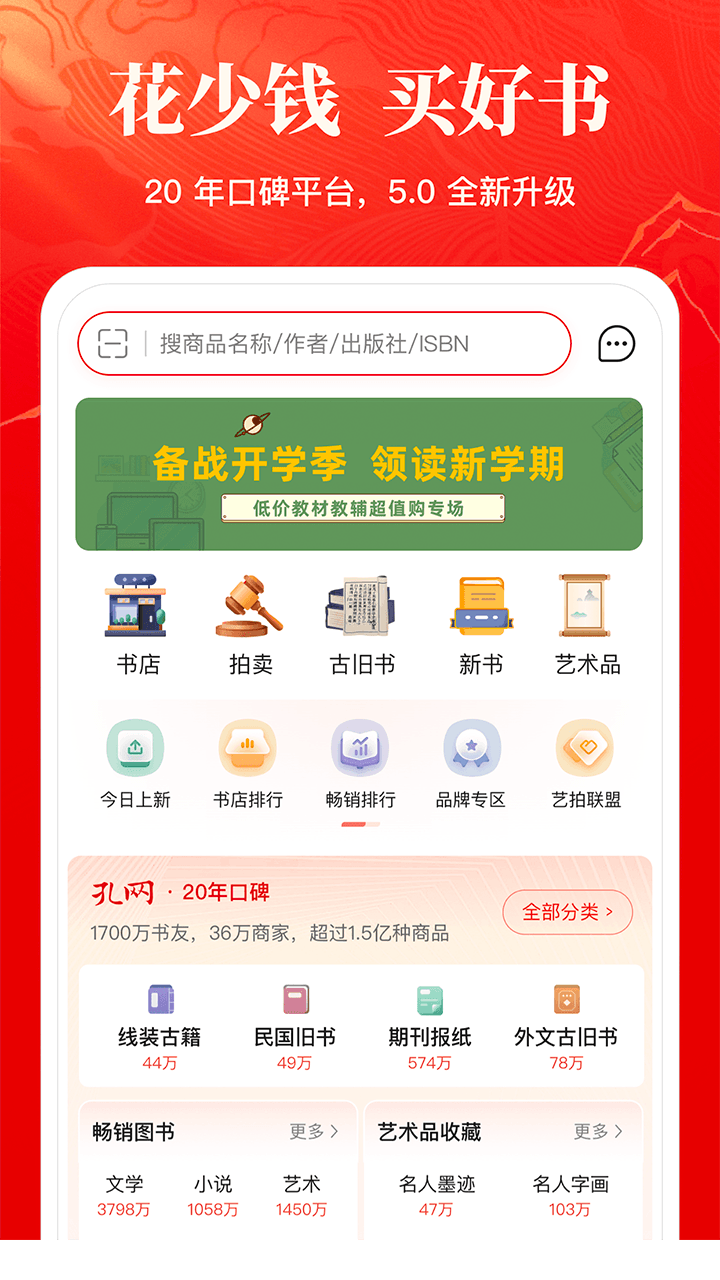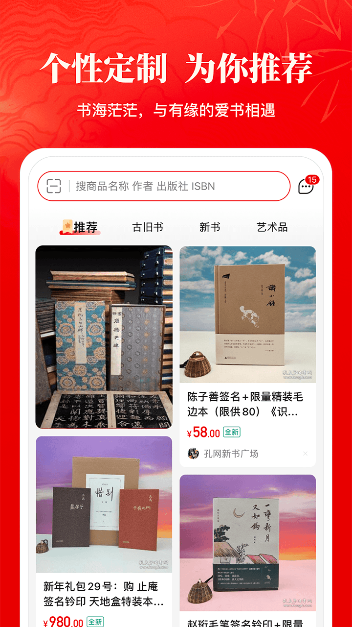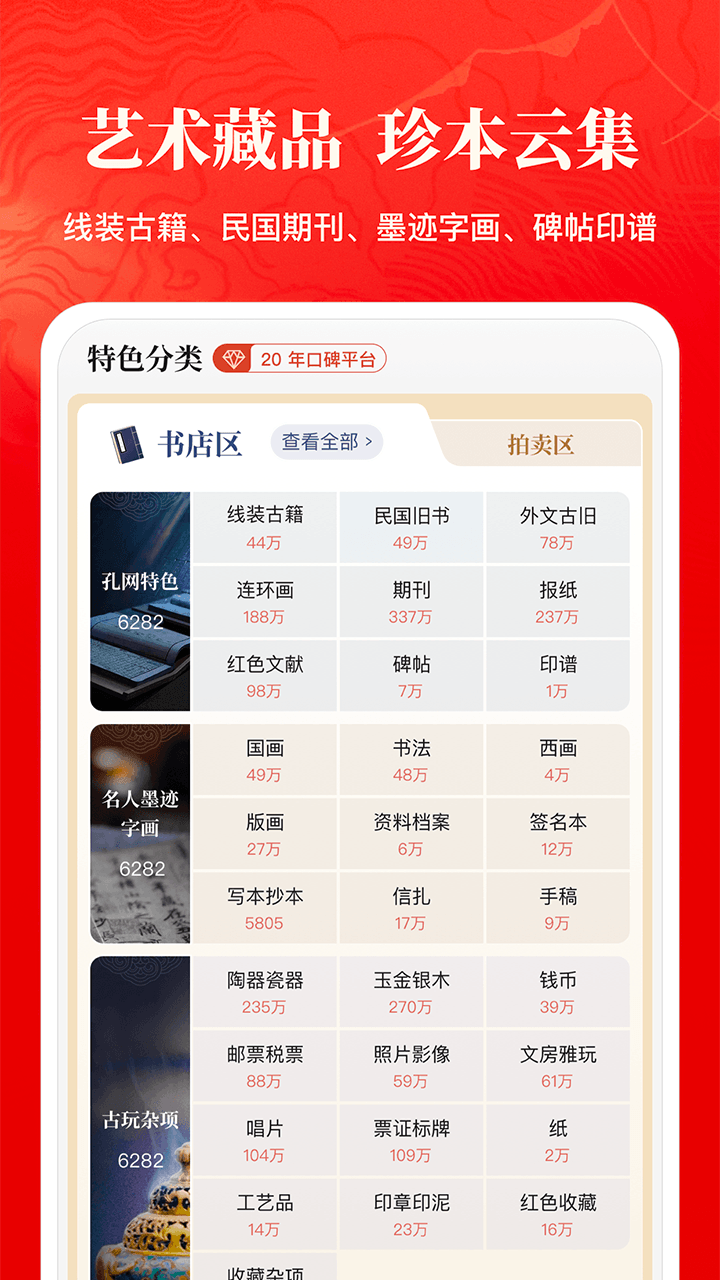 作为民间古旧书收藏的风向标,孔网为买卖双方提供极具参考价值的古旧书籍交易拍卖数据。您可以免费开书店在线卖书,将个人藏书或艺术品交易变现;也可以逛逛网上书店捡漏淘宝,享受淘书乐趣。