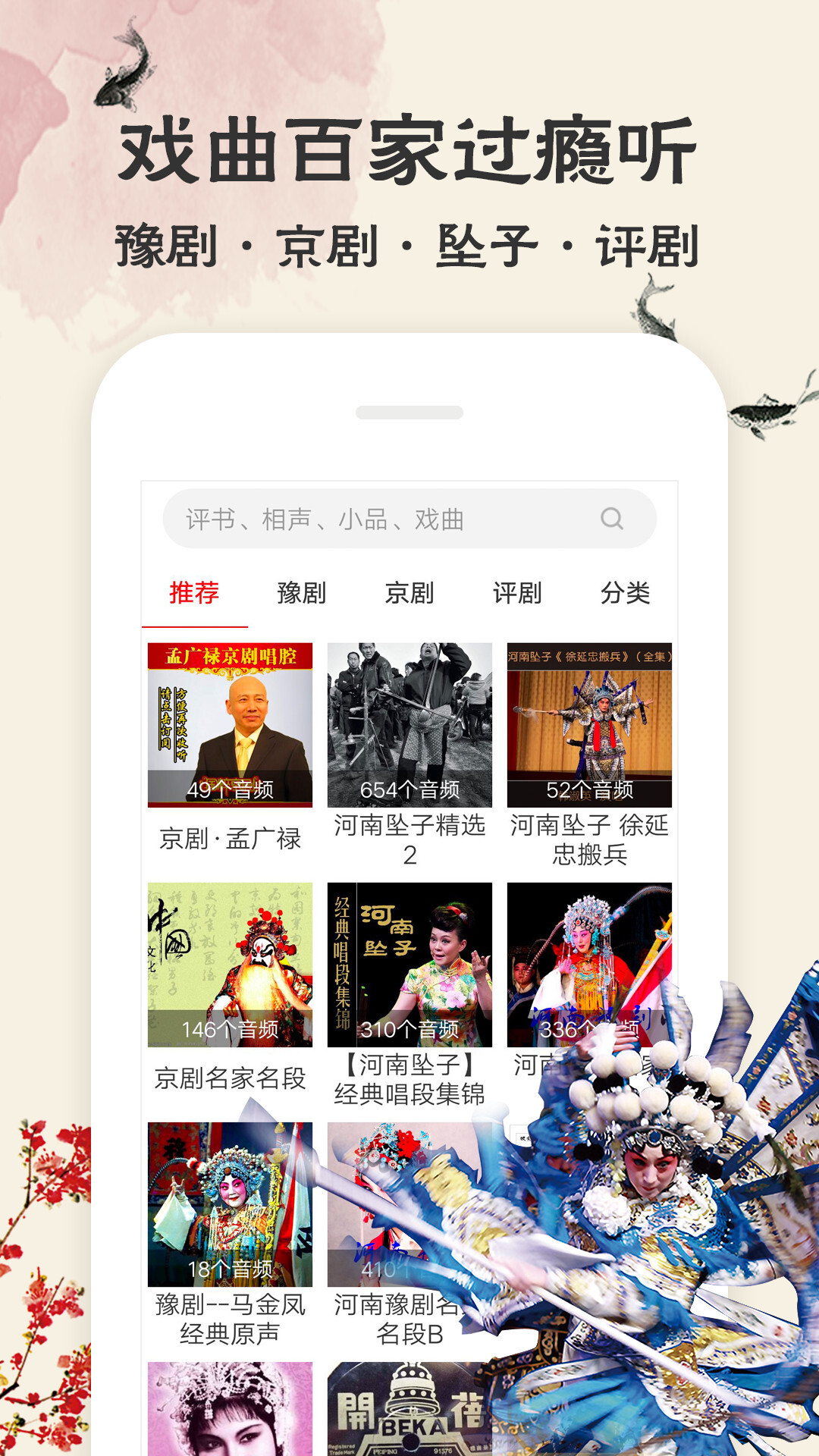 经典豫剧、京剧、秦腔、评剧、晋剧、越剧、昆曲、淮剧、川剧、黄梅戏、二人转、梆子等众多曲种经典名段;穆桂英挂帅、朝阳沟、关汉卿、孟丽君、打金枝、花木兰、贵妃醉酒、铡美案、白蛇传、苏三起解等众多名曲全都有。