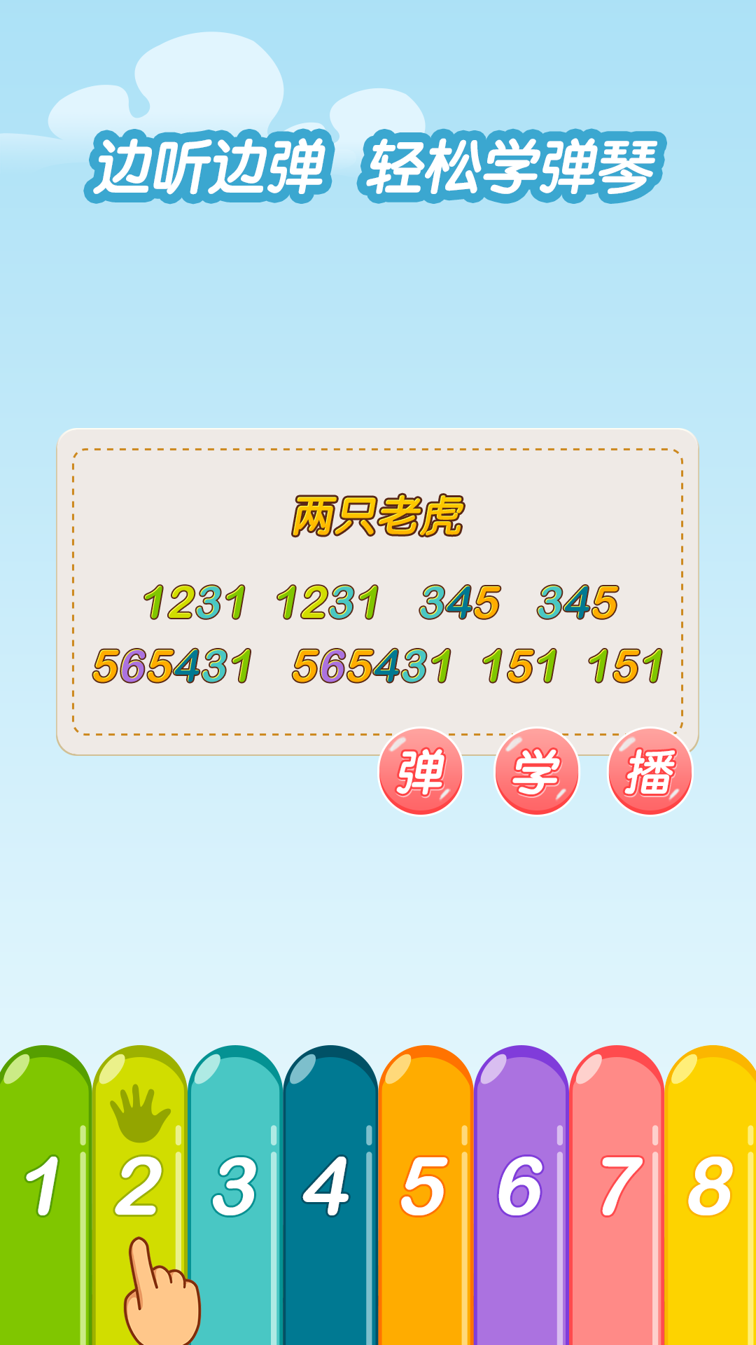 熟练掌握1-8个阿拉伯数字,跟着小节提示进行演奏,变身小小音乐家。