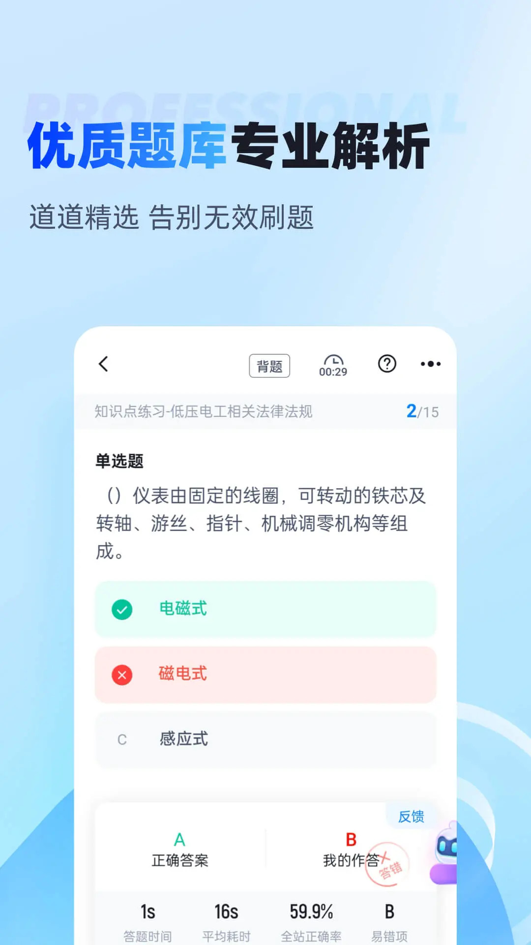 在电工考试聚题库中,用户可以免费获取大量电工考试相关的题库资源,包括章节练习、模拟试卷和历年真题。每道题目均配有详细解析,帮助用户理解考点,掌握解题思路。通过电工考试聚题库的分类练习功能,用户可以根据自身学习进度,有针对性地强化薄弱环节。