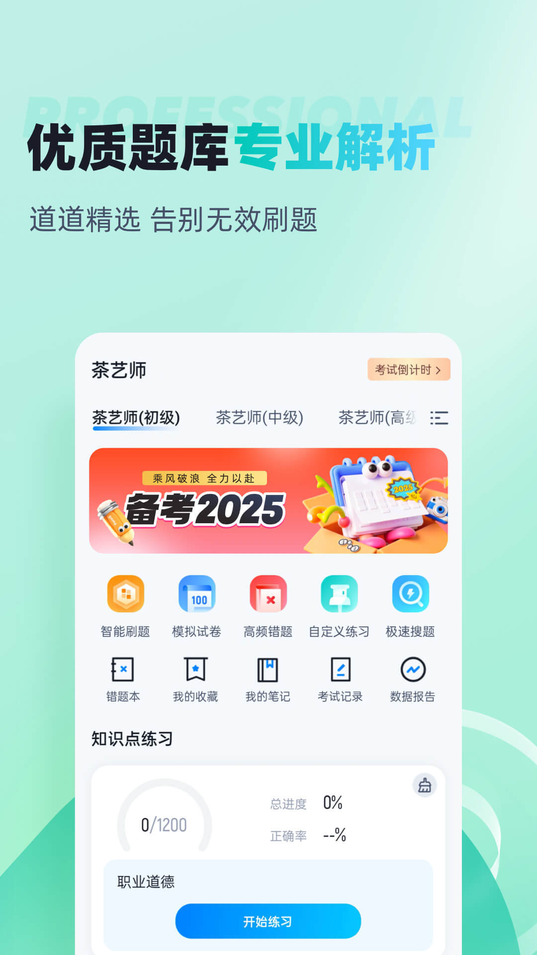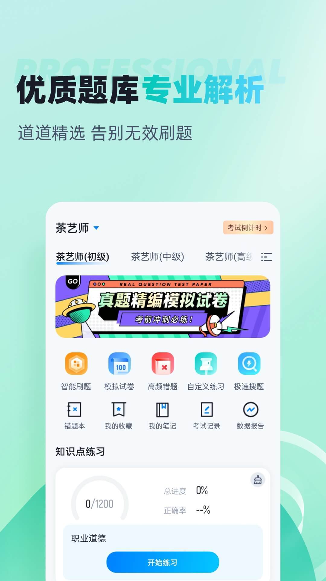 茶艺师题库内含考点练习,全国通用卷以及地区卷模拟练习,以及按照固定考试比重的随机式的抽题的真题考场,成绩单实时记录考试数据,一点一滴的反馈考生近期学习状态以及自我正确率的提升,大大的给予考生通过考试的信心。