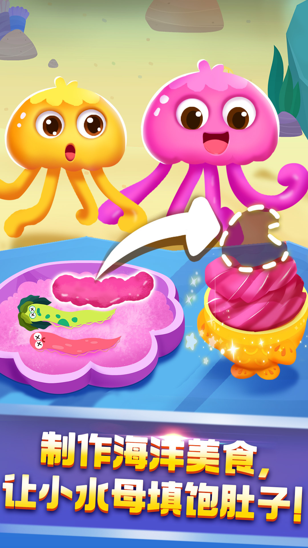 落石清理完毕,接下来就该进入洞窟,寻找水母宝宝啦!寻找时,宝宝可要注意安全:前方有礁石,绕开它才不会撞晕;洞窟中还有电鳗出没,宝宝快躲开!瞧,终于找到水母宝宝啦。