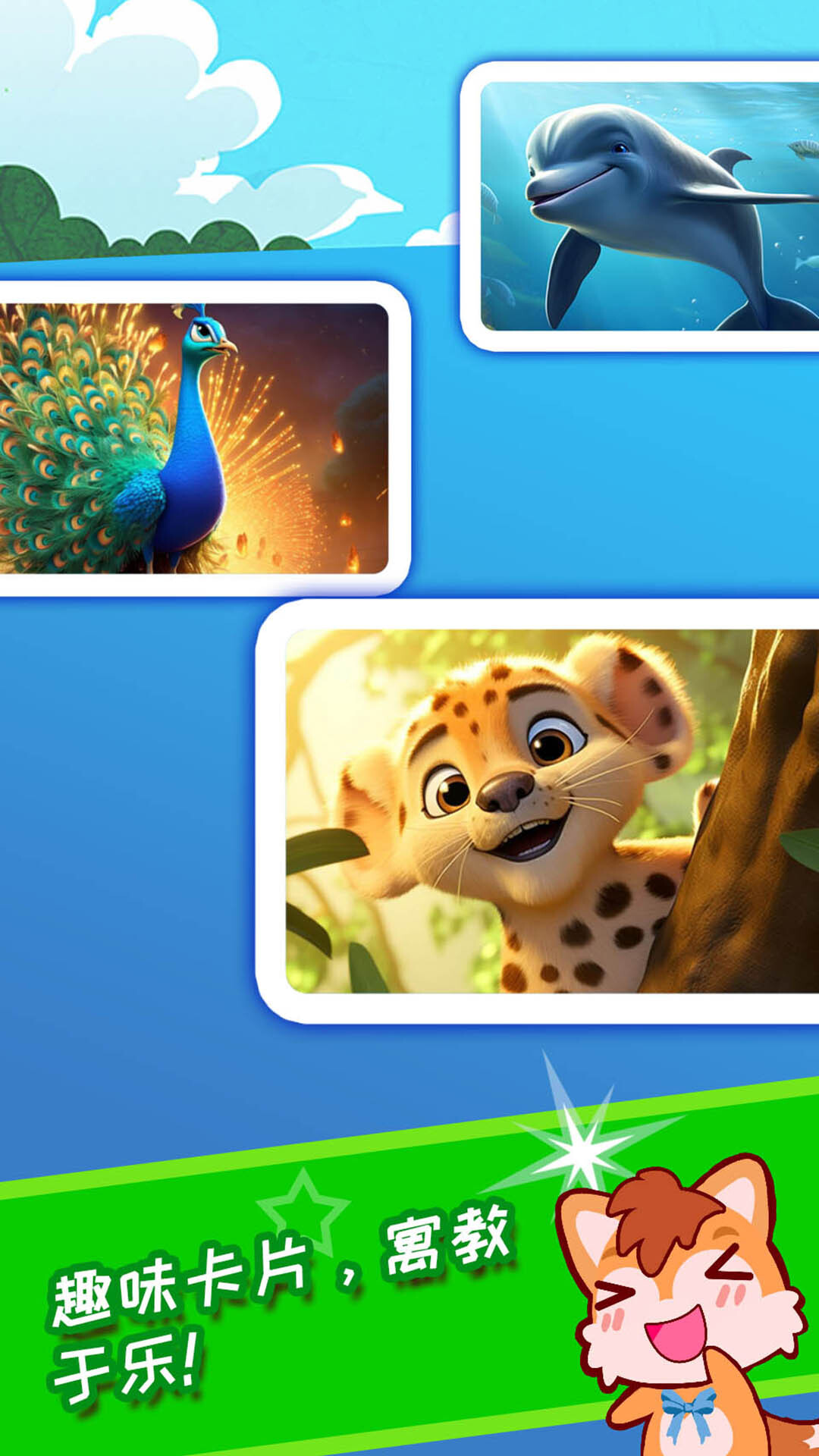 看图识字结合精美图片+中英文发音,带领宝宝认知汉字,拼音,英语单词等。软件通过卡通图卡,有趣的声音,配以单词朗读,认知常见的动物、水果、蔬菜、文具、玩具、交通工具、海洋生物等。