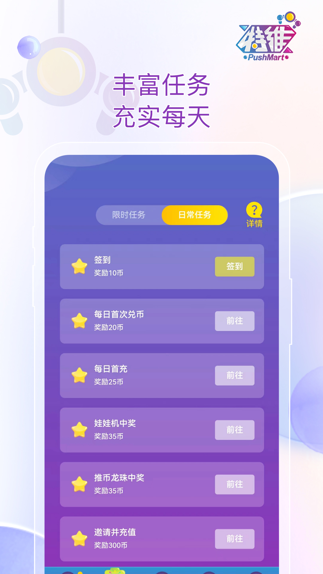 特维潮玩是一款通过手机在线畅玩各类游戏机台的软件。以二爪娃娃机为主营方向,结合了各类新奇有趣的抓娃娃玩法及高端潮玩礼品。