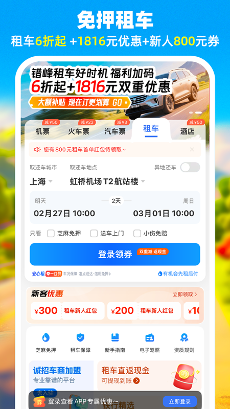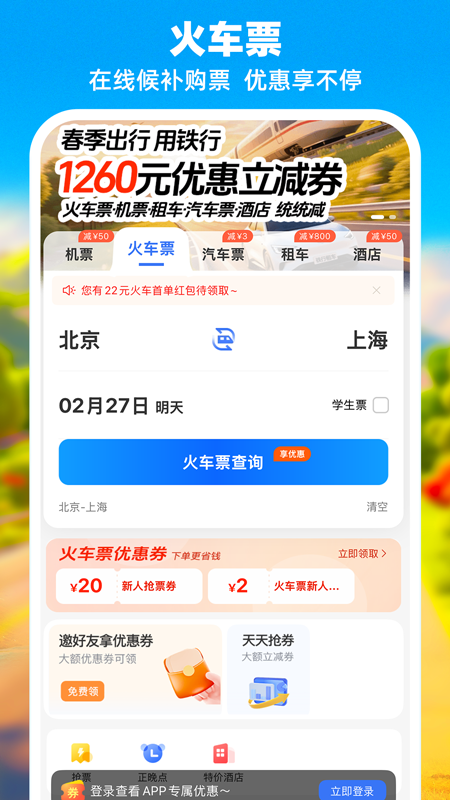 新人专享919元出行大礼包+春季1280元优惠礼包券 特价机票、火车票、租车、汽车票、酒店都可减