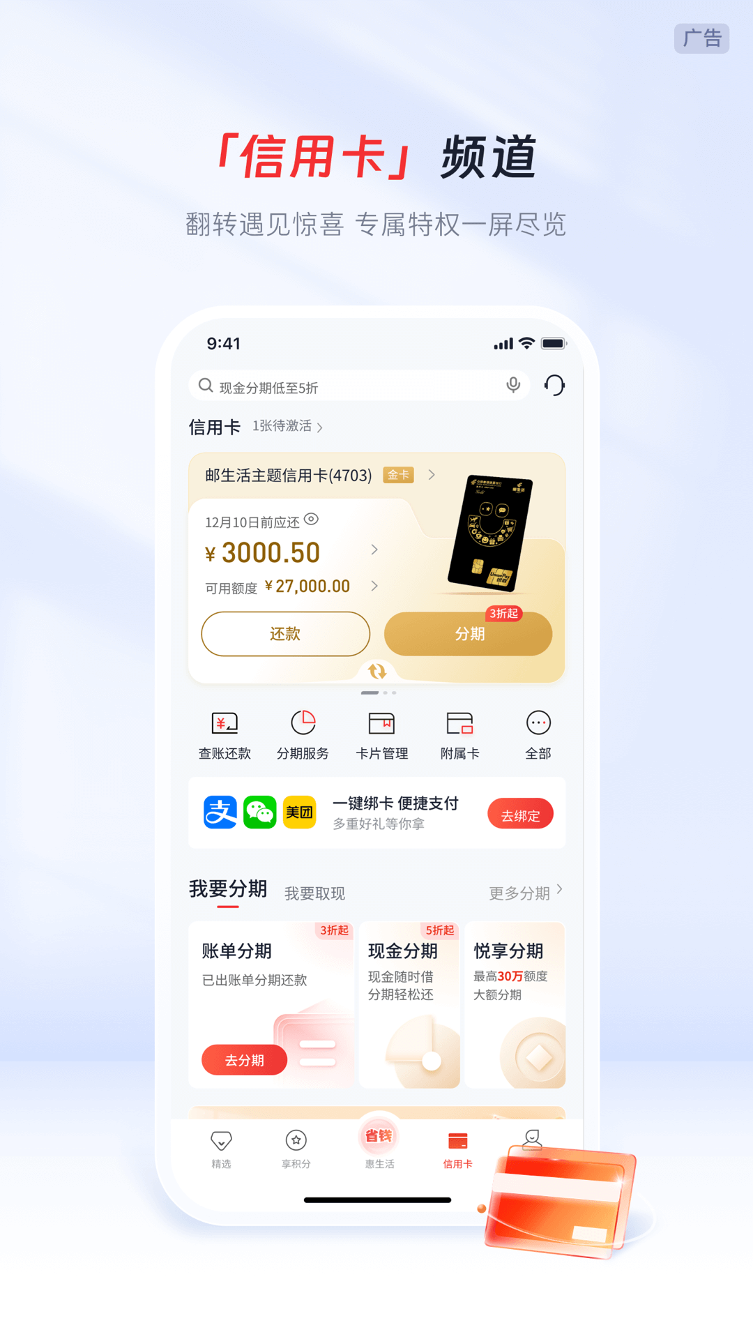 邮储信用卡APP由中国邮政储蓄银行官方出品,秉承“进步与您同步”的理念,为您提供安全、便捷、多样的网上自助金融服务,是一款汇集生活、消费、金融服务为一体的综合服务平台。邮储信用卡APP分五个模块:精选、享积分、惠生活、信用卡、我的,可提供账单查询、还款、积分兑换、分期申请、额度管理等金融功能,加油洗车、爱车养护、影票购买、话费充值、美食商圈等生活场景服务,更有白金服务、原创主题、大字版、语音搜索等特色服务。