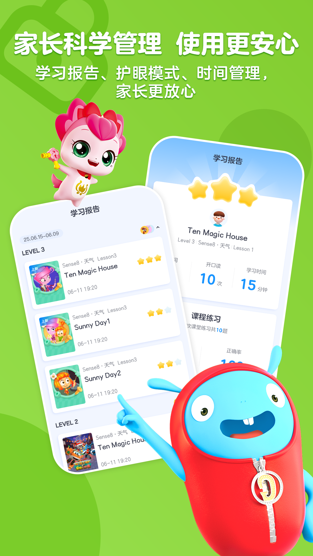 2、英语学习新增“成长计划”,结合英语生活场景词汇分级分阶有计划学习,生成孩子学习报告,掌握学习进度。