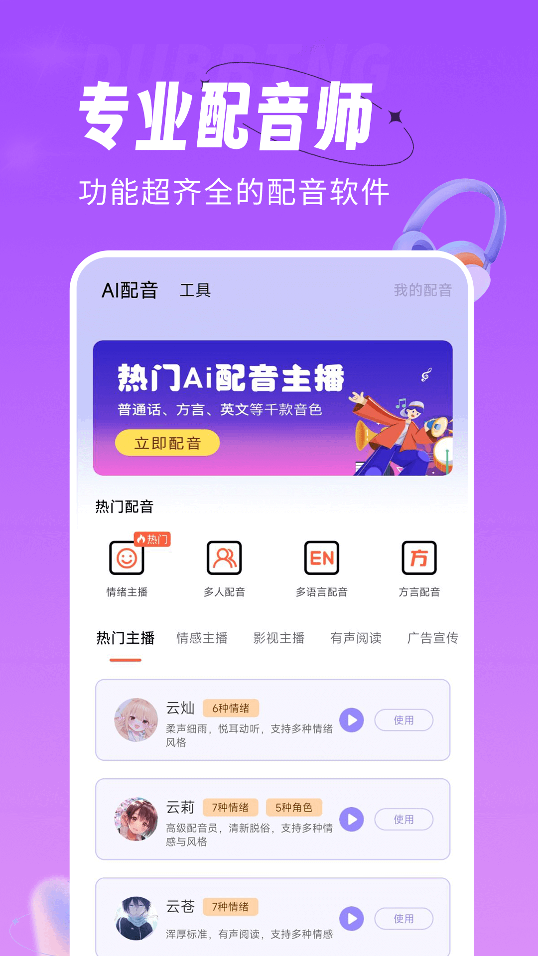 1、智能配音:多种热门配音主播任您选择,普通话、方言、英文、日文、韩文等等千款音色,输入文字、选择配音主播、添加背景音乐,一键合成自己想要的配音,简单高效。