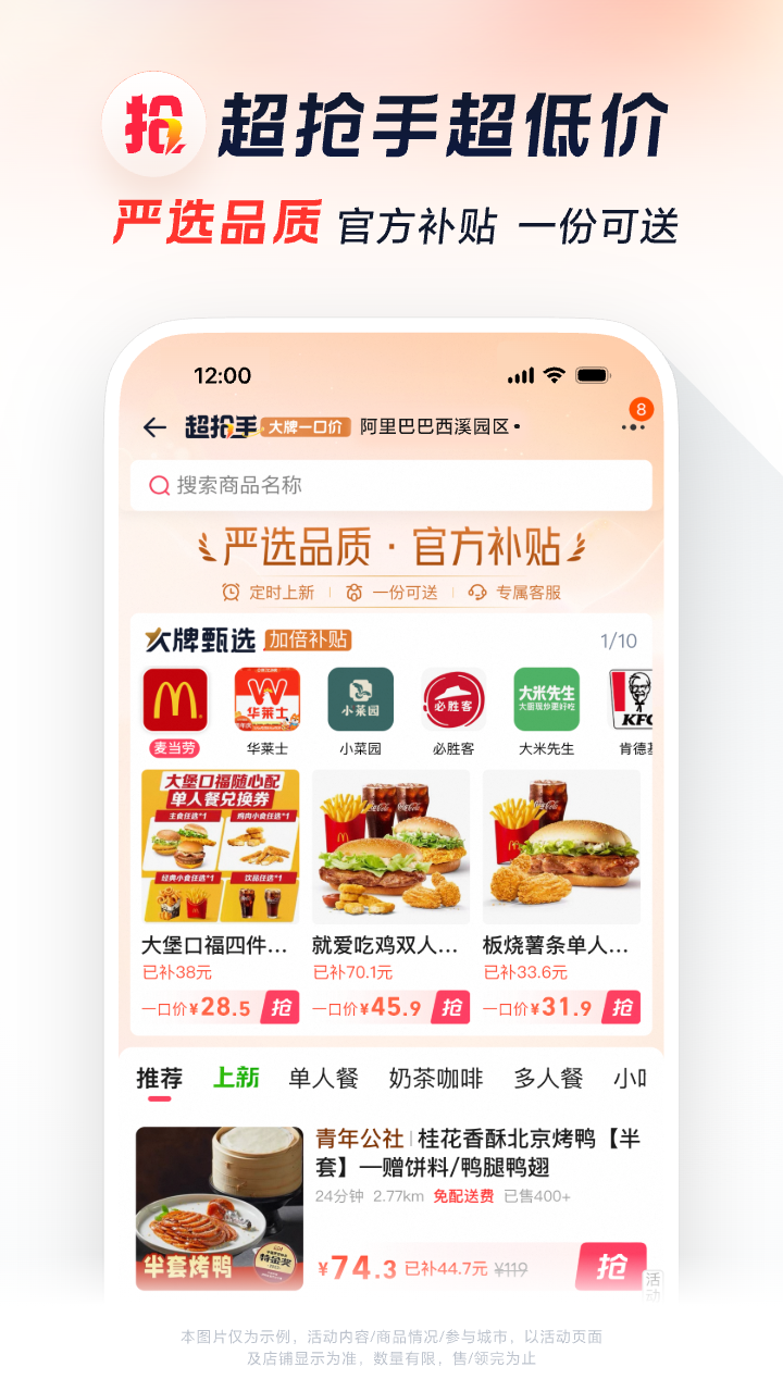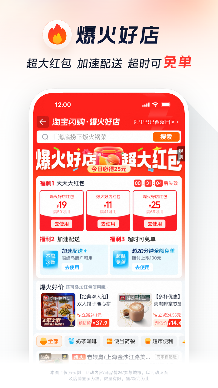 网罗周边各类外卖,中餐、西餐、快餐、简餐、火锅、烧烤、烘焙、汉堡、早餐、下午茶、夜宵、甜点、甜品、水果、鲜花、果蔬、生鲜、蛋糕、寿司、咖啡、超市购物……各类特价优惠套餐、满减折扣优惠、立减优惠套餐,便捷生活,一手掌握,尽在淘宝闪购!