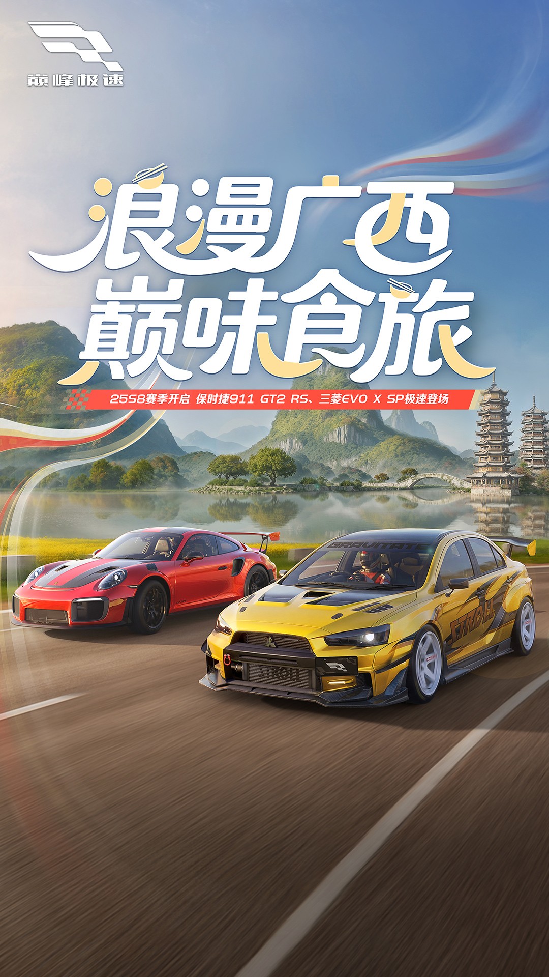 浪漫广西,巅味食旅!《巅峰极速》25S8新赛季开启,全新赛季主题玩法、新车、新赛道正式上线!全新限定传奇「保时捷911 GT2 RS」首发登场、全新主题玩法「星极餐厅」带你解锁车手副业、广西特色赛道山水画卷「桂林」正式开放!更有全新限定传奇「三菱EVO X」限时送出、系列典藏&珍藏传奇限时返场,更多惊喜福利活动等你解锁!