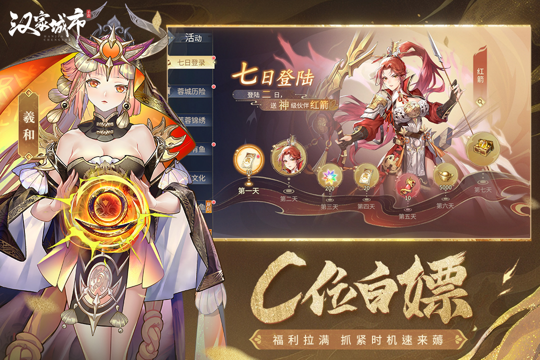 每日登录领丰厚福利,好礼天天不重样!次日解锁神级伙伴【红箭】,第六日直接狂送1000黄金!